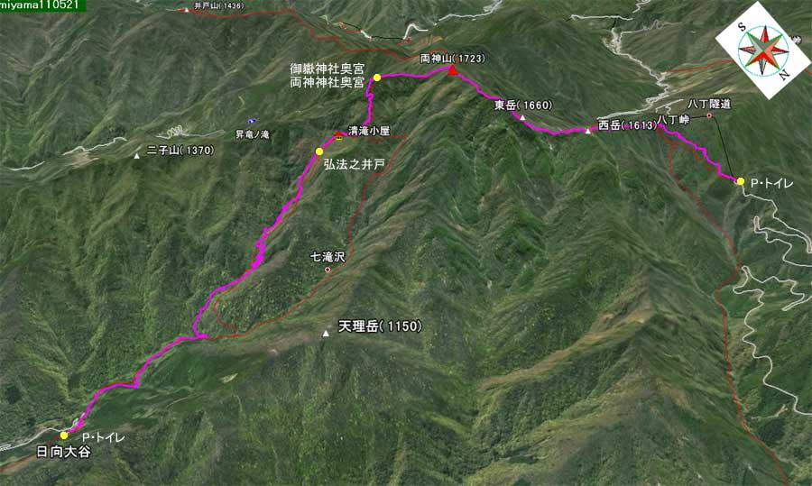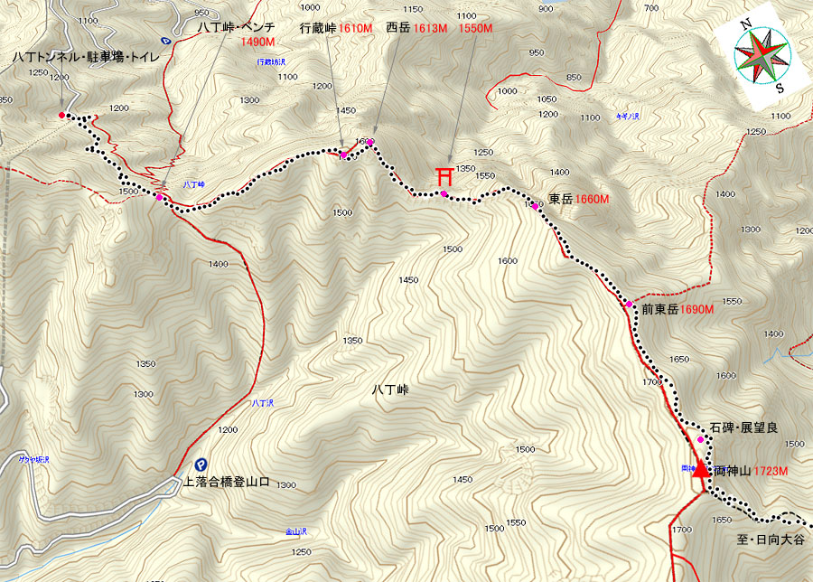 | (計曲線 50M 主曲線 10M) 日向大谷駐車場標高/660M(八丁トンネルP標高・1215M) 標高差/1063.5M 総歩行距離/10823M |
