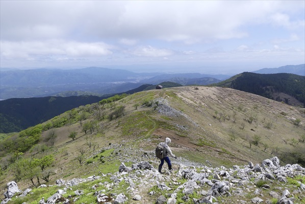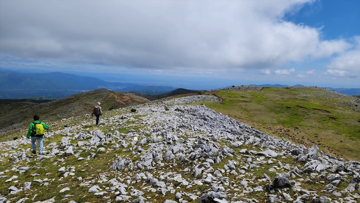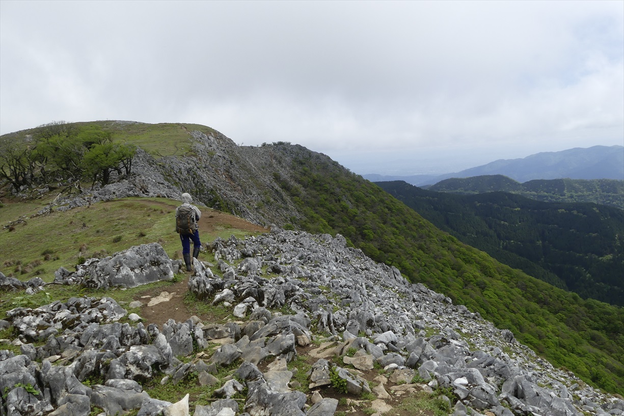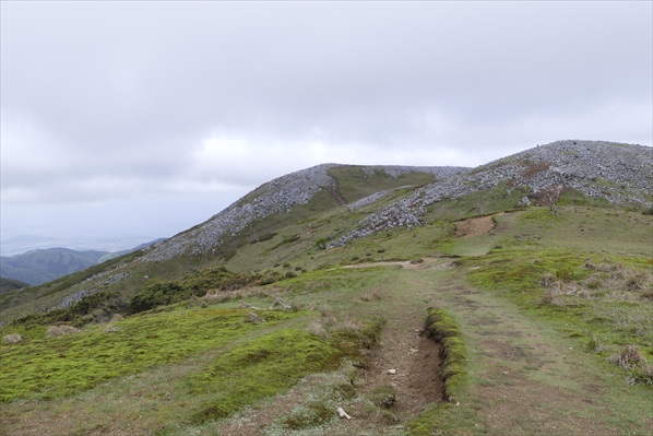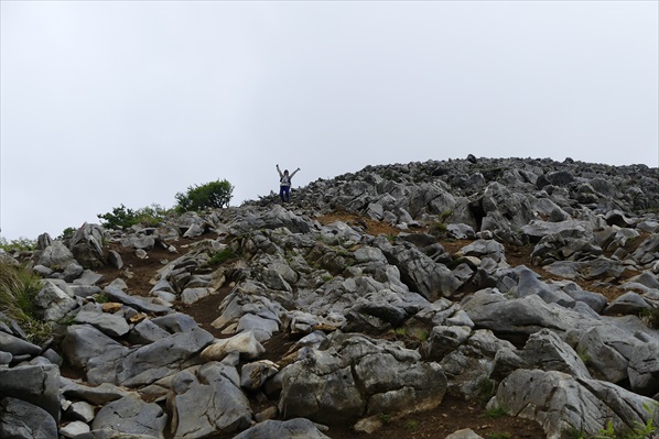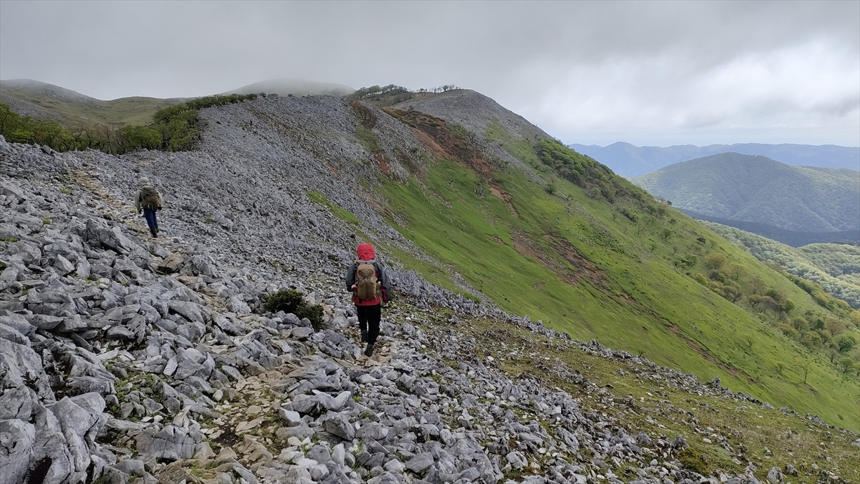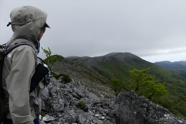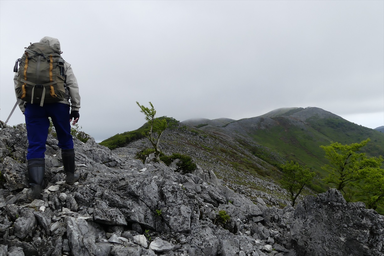 | 西南尾根をドンツキまで行って左カーブした先が最高点ピークと霊仙山 体重70㌔近い爺でもふらつくほどの強風が吹き荒れている (ノД`) |