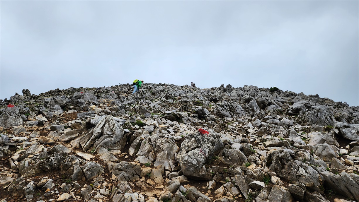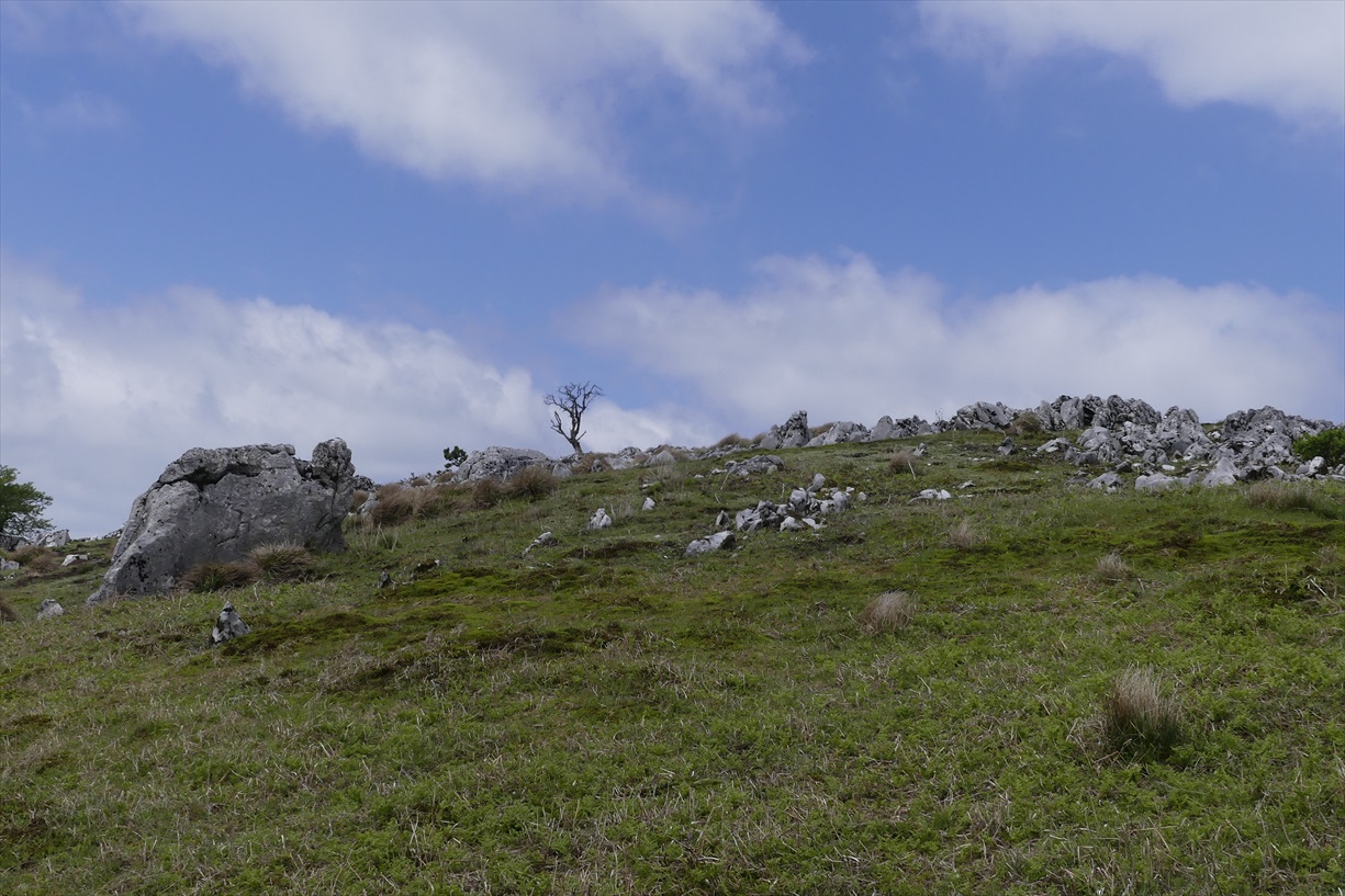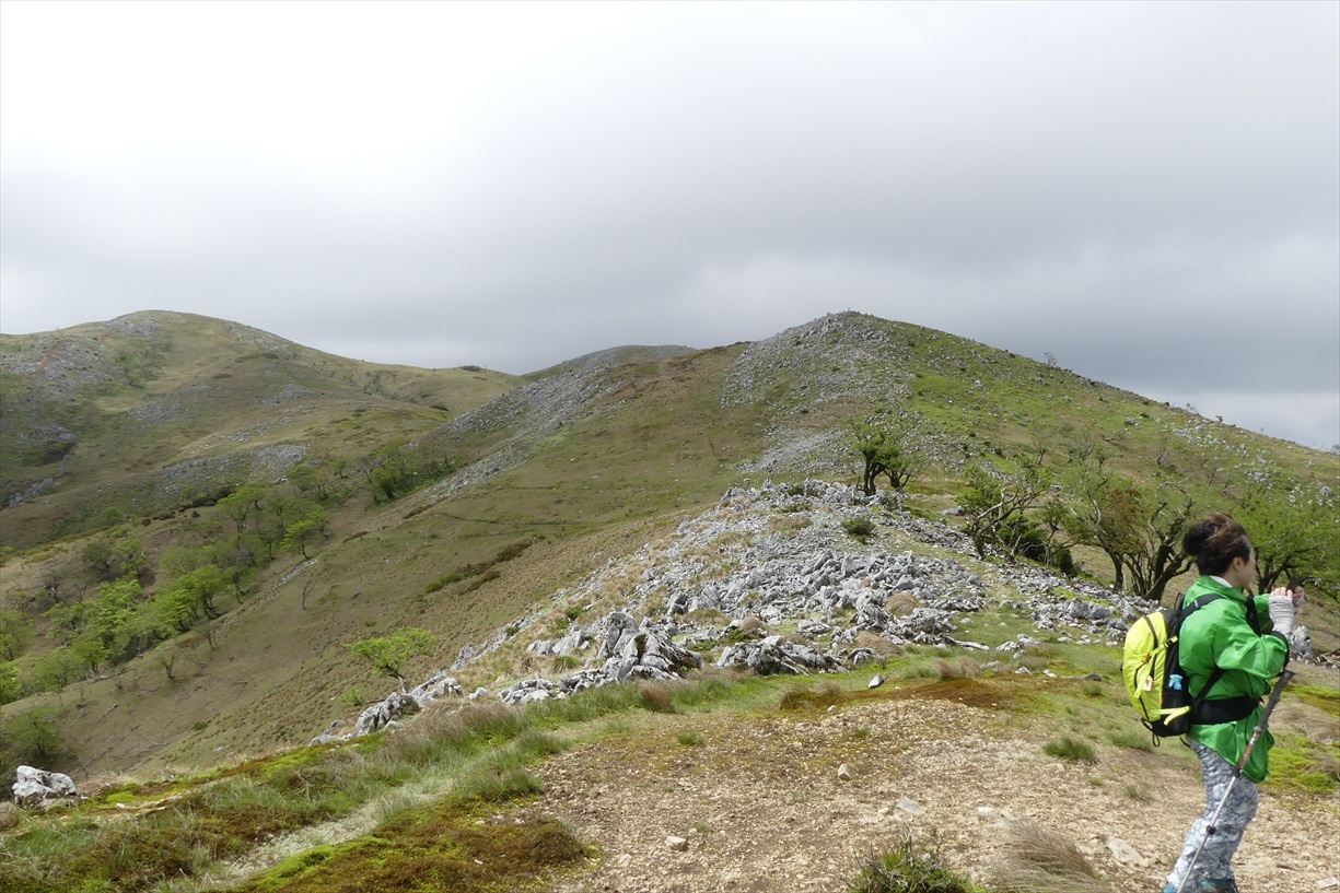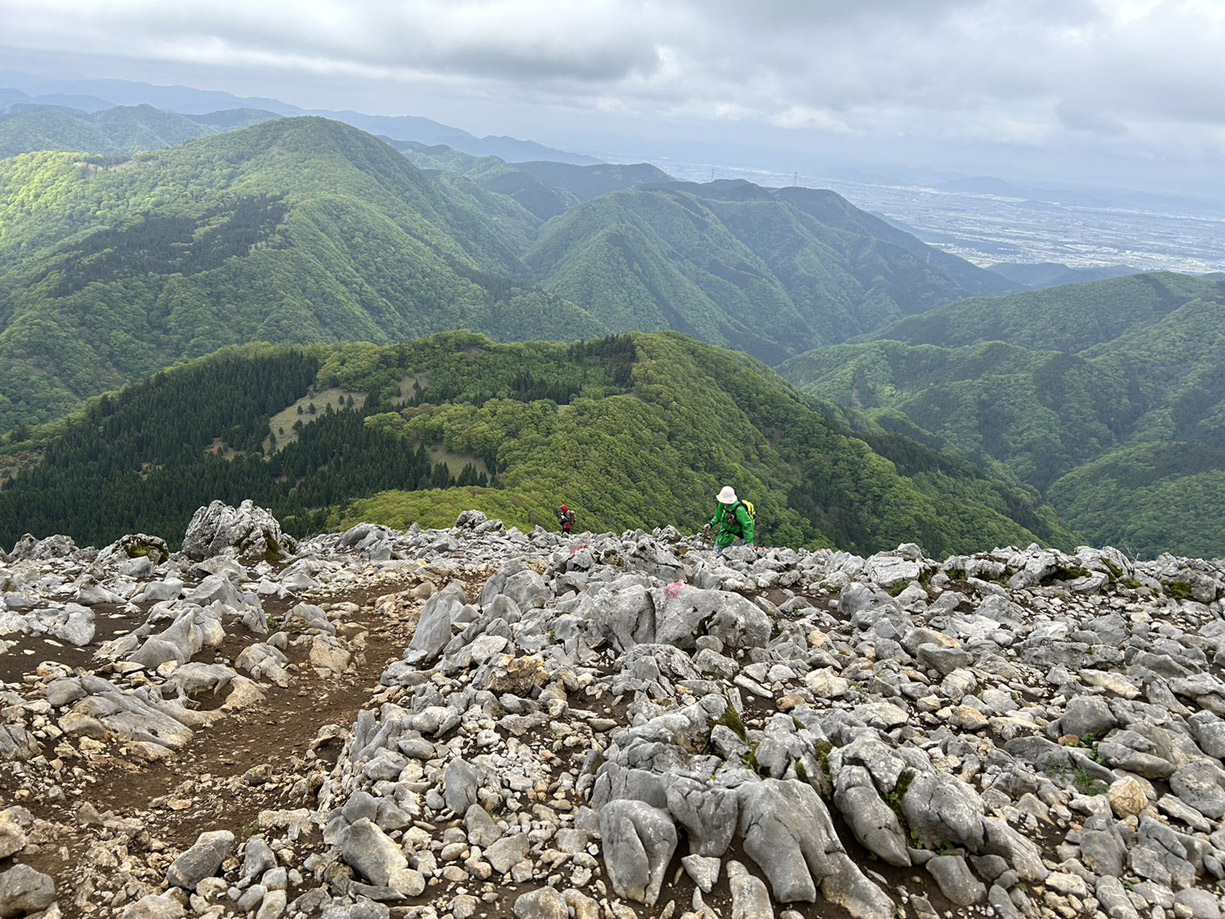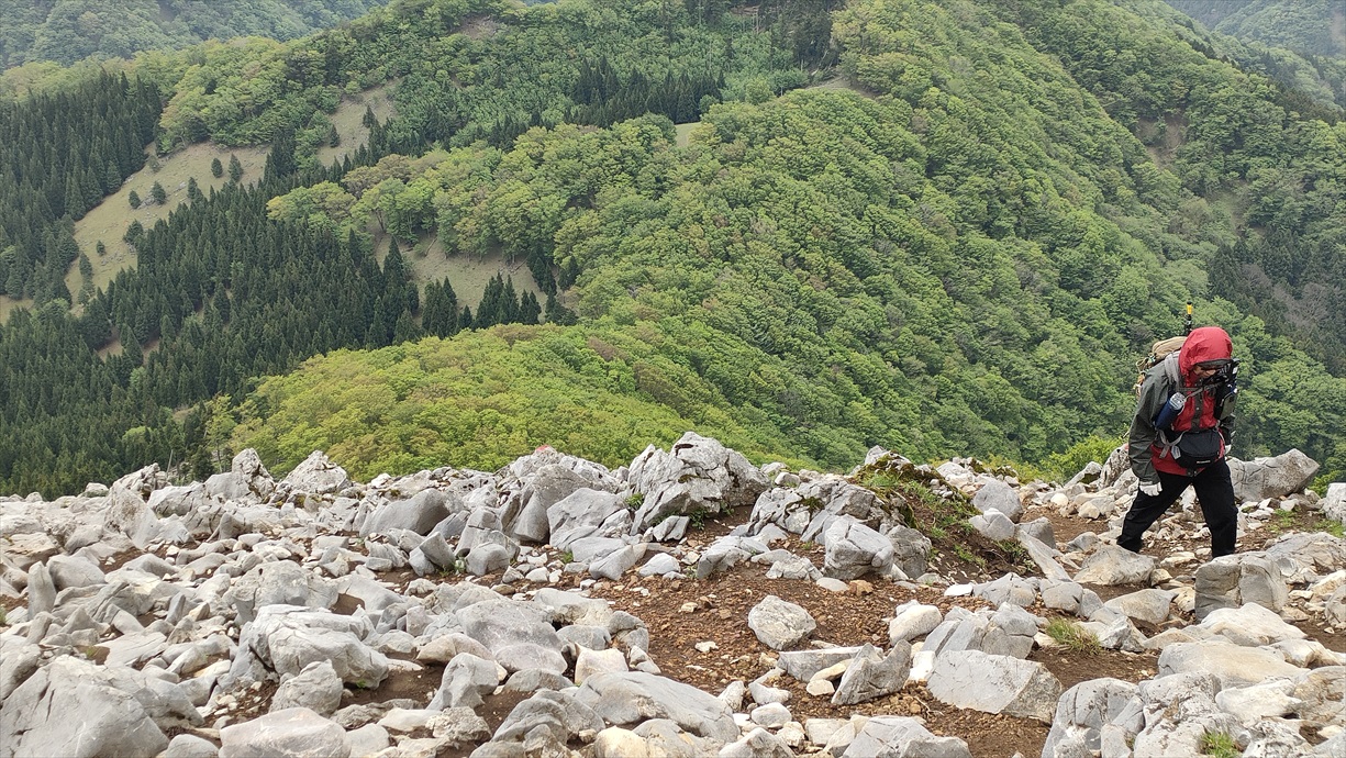 | 西南尾根をドンツキまで行って左カーブした先が最高点ピークと霊仙山 体重70㌔近い爺でもふらつくほどの強風が吹き荒れている (ノД`) |