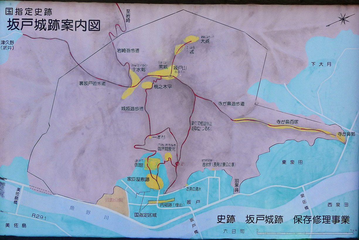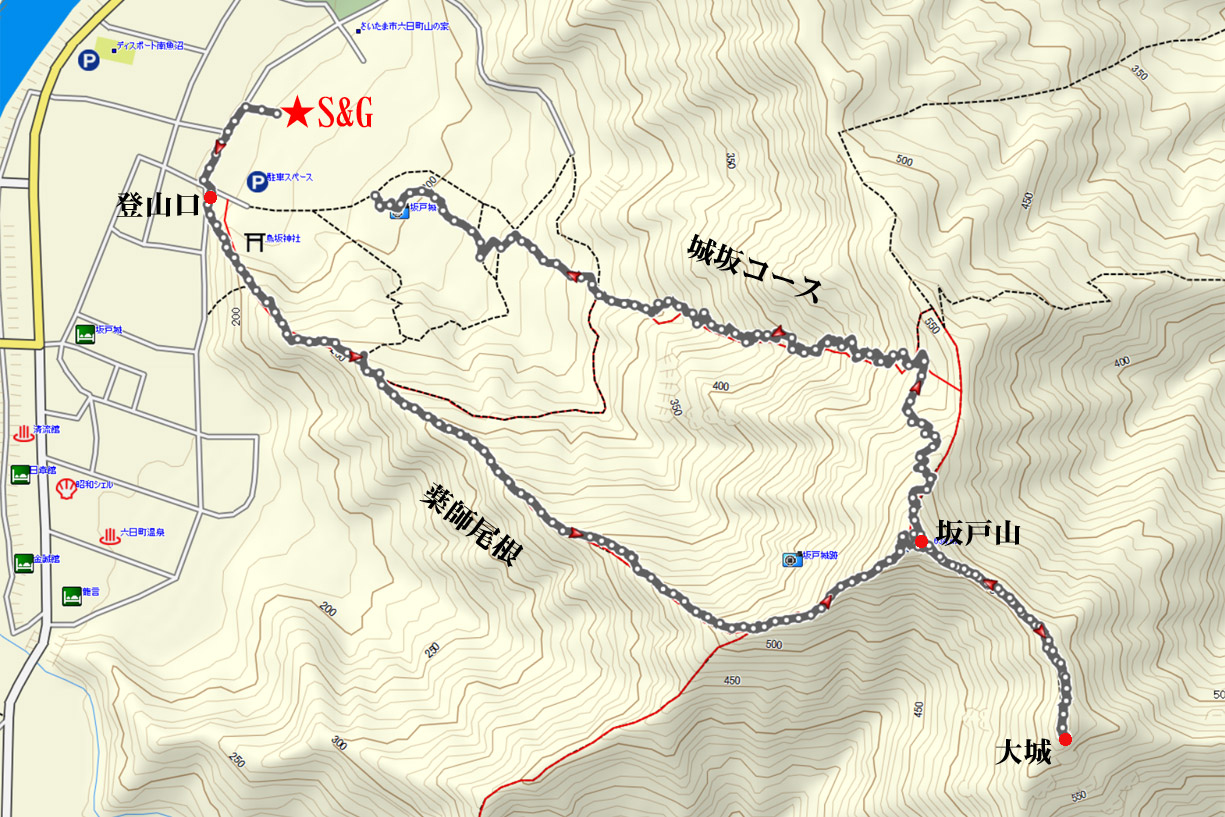 | 坂戸山ルート地図/坂戸城跡でGPS停止 (計曲線 50M 主曲線 10M) |