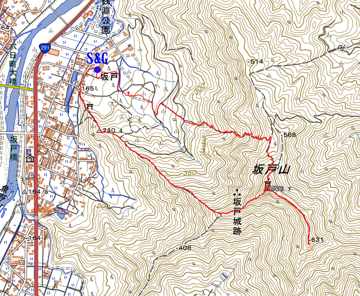 | 坂戸山ルート地図 (計曲線 50M 主曲線 10M) |