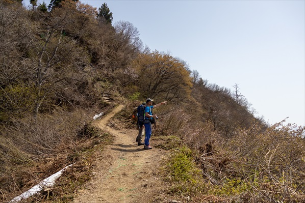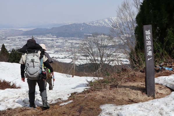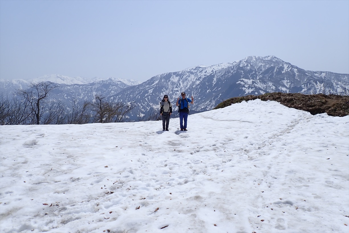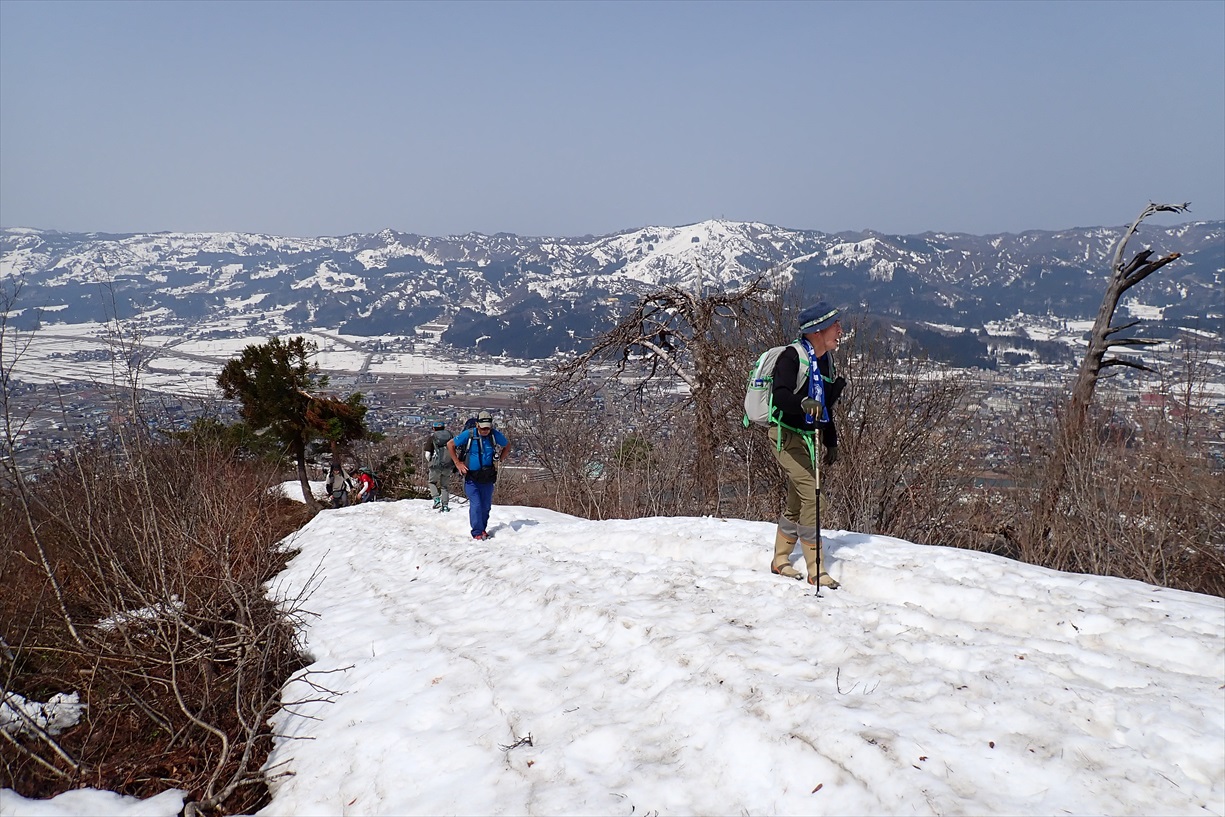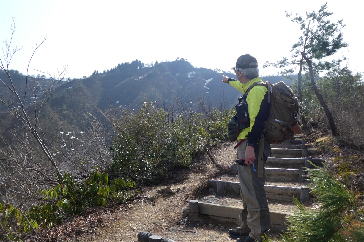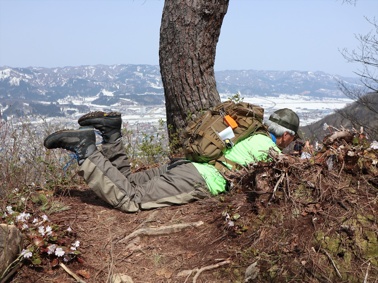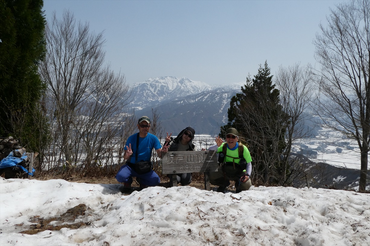 | 金城山をバックに記念撮影 カタクリ群生地となるので残雪期限定撮影場所です 坂戸山大城からのパノラマ図解あり |