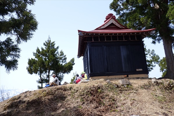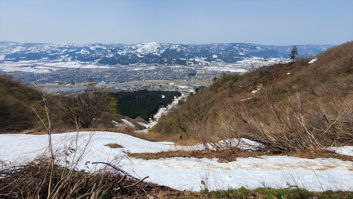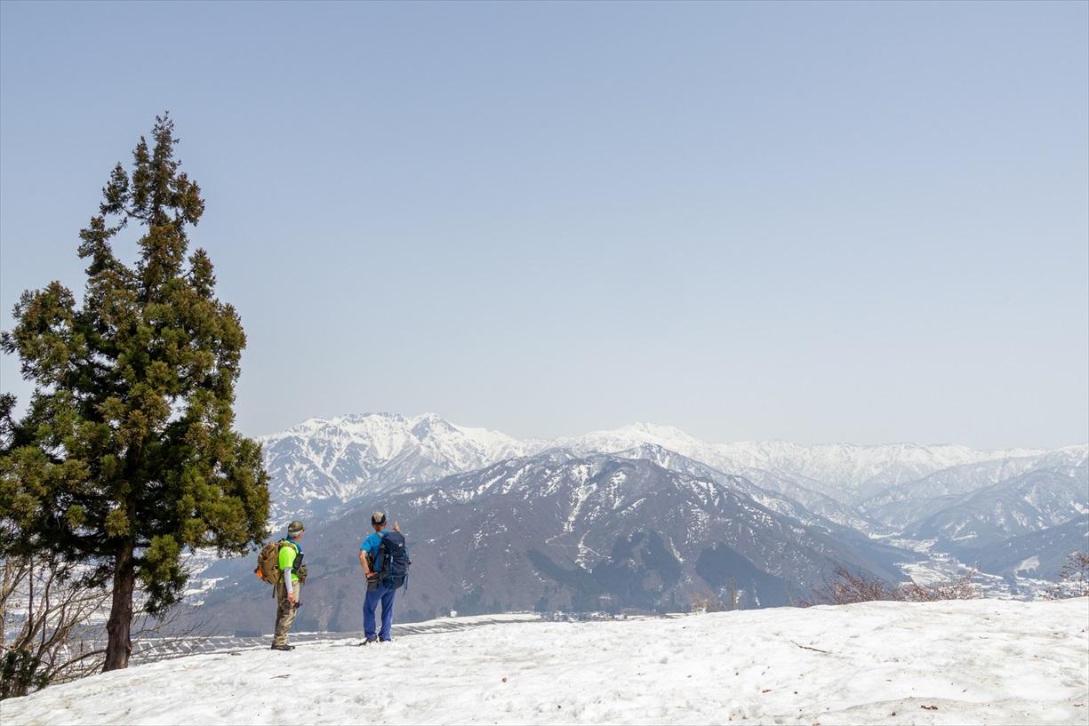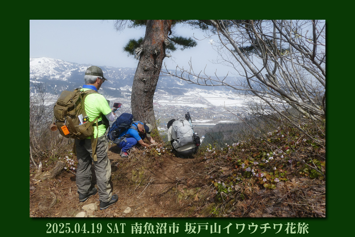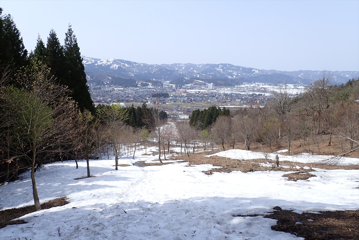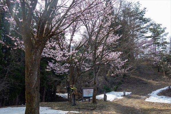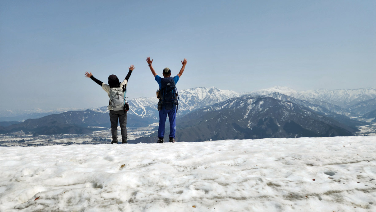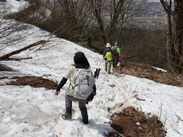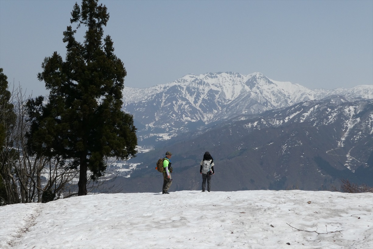 | 金城山をバックに記念撮影 カタクリ群生地となるので残雪期限定撮影場所です 坂戸山大城からのパノラマ図解あり |
