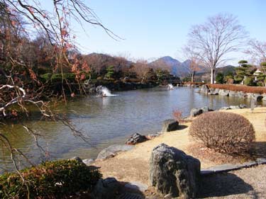 | 御荷鉾の山々を背景に1500トンの三波石を用いた池泉回遊式庭園 らくだコブの山が御荷鉾山 |