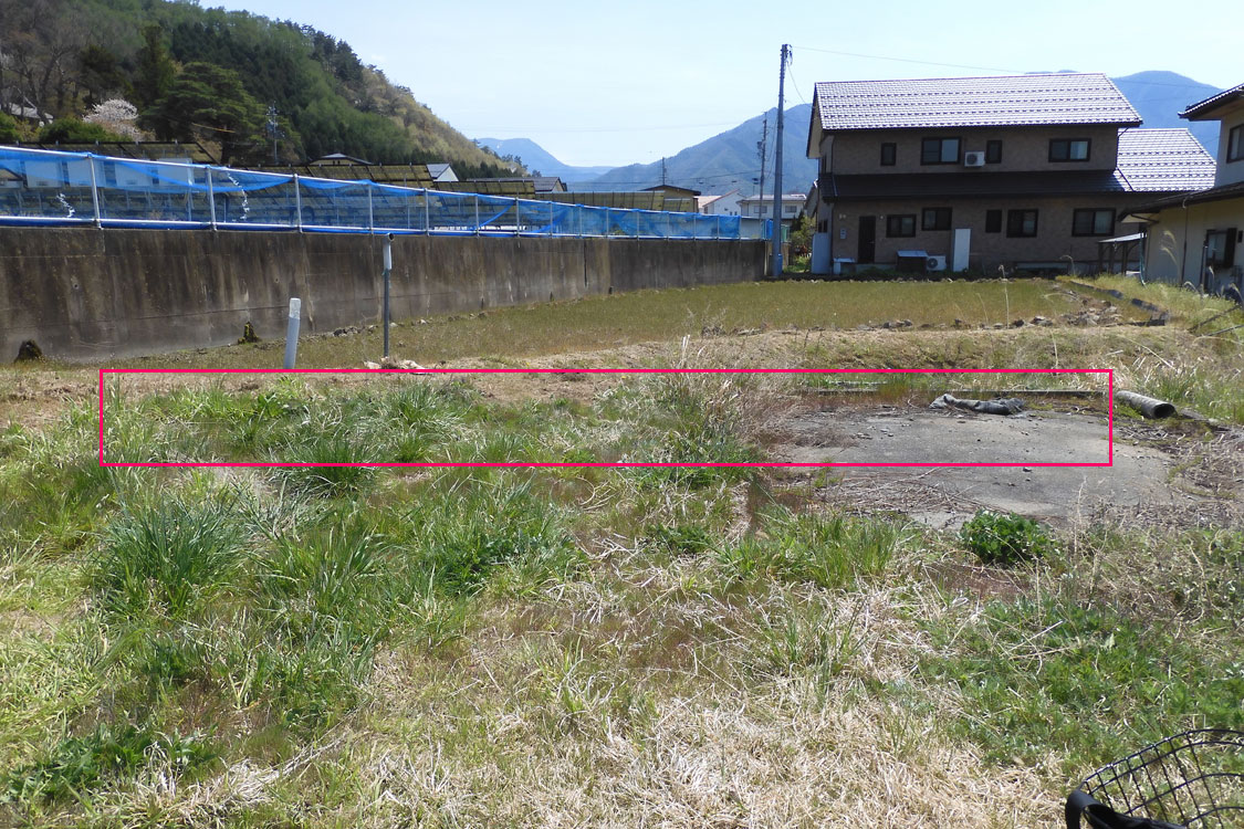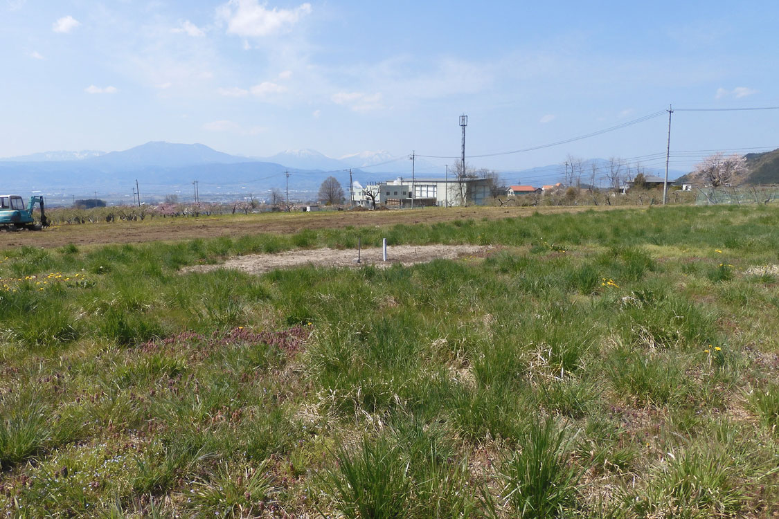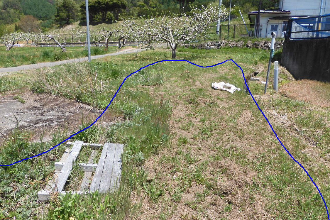 | 草が刈り取られている場所は須坂市所有とのこと 国土地理院データとGPSデータを重ねれば間違いなくこの辺なのだが・・・ |