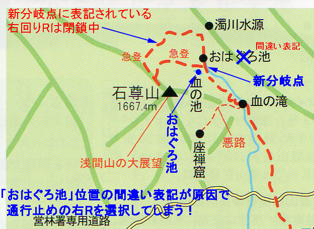 新分岐点で記載されているが「おはぐろ池」の表記場所間違いにより、高原地図と同じルート表記と勘違いをしました(;´Д`) |