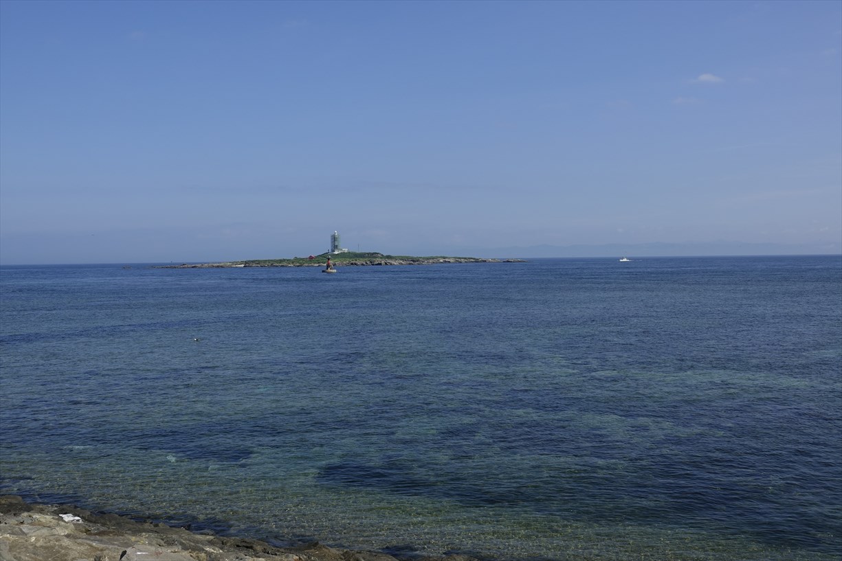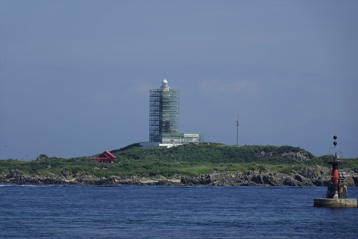 | 大間埼灯台(日本の灯台50選)は白黒ツートンの珍しい灯台ですが化粧直し中でした | ||||