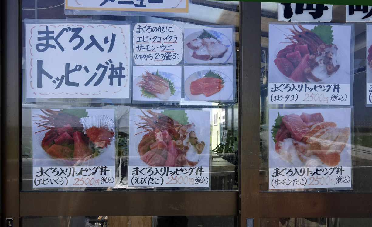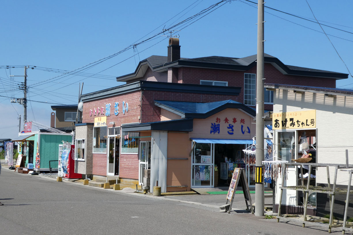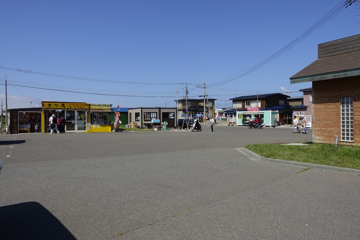 | 大間の駐車場を囲むように店舗が並ぶ(右の建物はトイレ) | ||||
