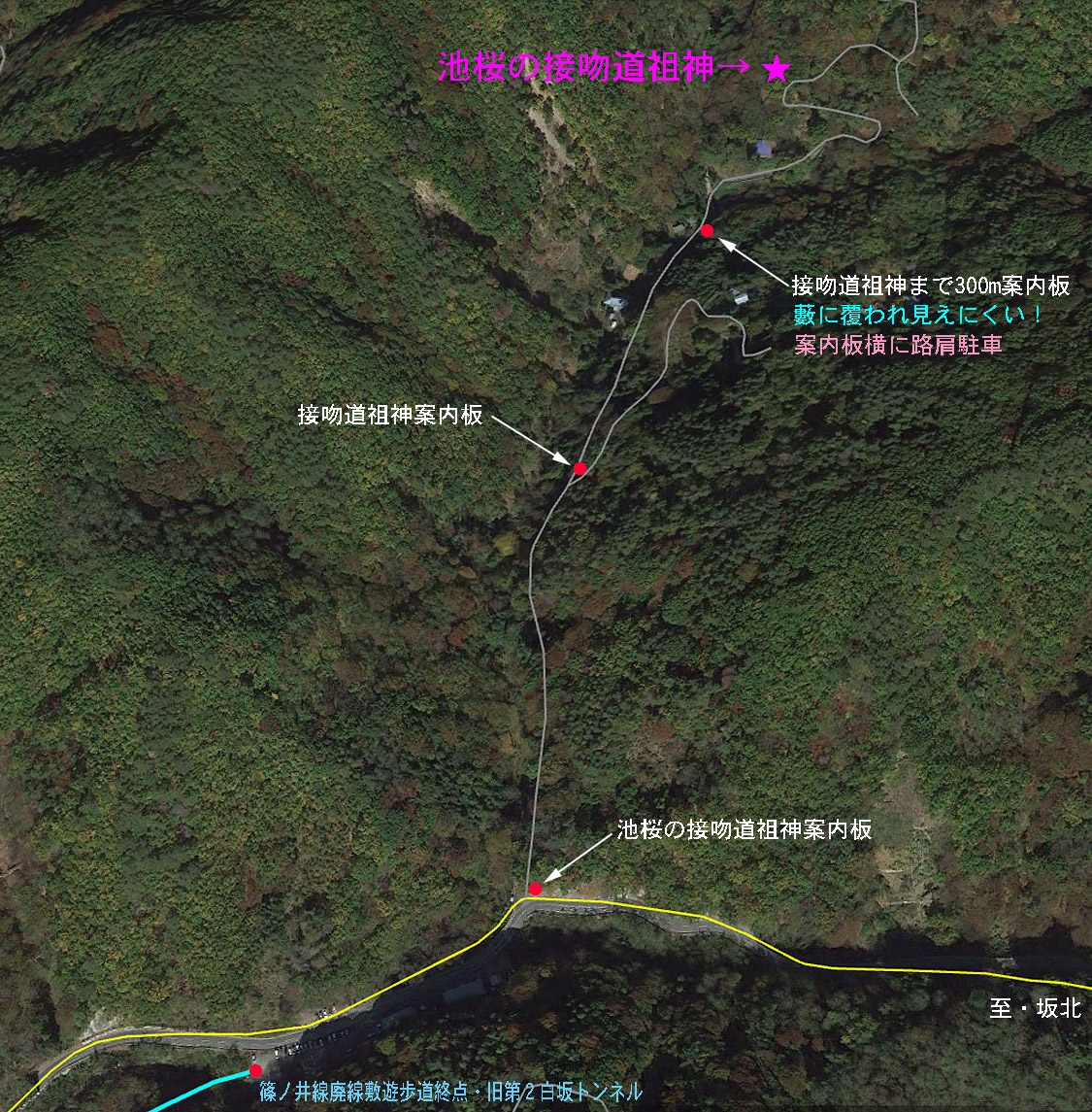 | 道路右上・道祖神まで300M案内板横に路肩駐車スペースあり | ||||