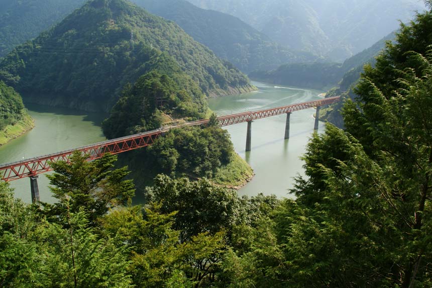 | 奥大井湖上駅(中央)とレインボーブリッジ全景 湖上駅から遊歩道を利用してこの展望台まで来ることができる!! (車で来ることもできるが駐車スペースは2台のみ) |