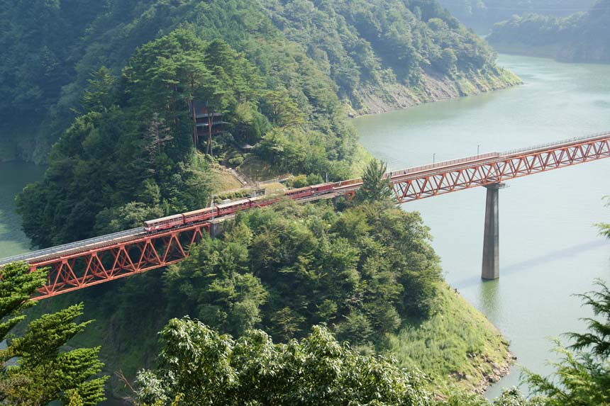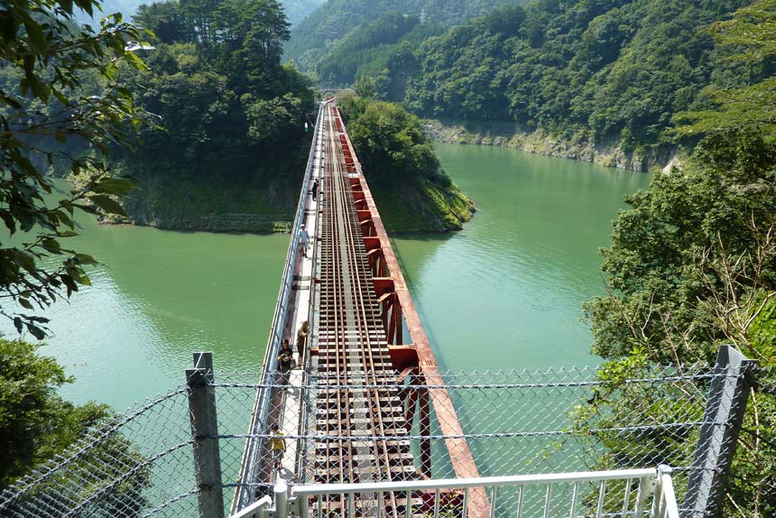 | 奥大井湖上駅(前方)とレインボーブリッジ 観光施設がない湖上の島に駅が設けられているだけでも珍しいうえ橋を渡ることもできるので観光客で賑わう |