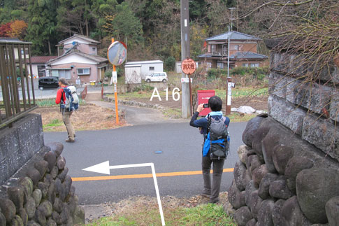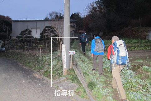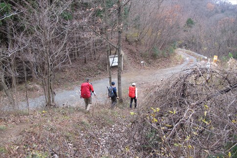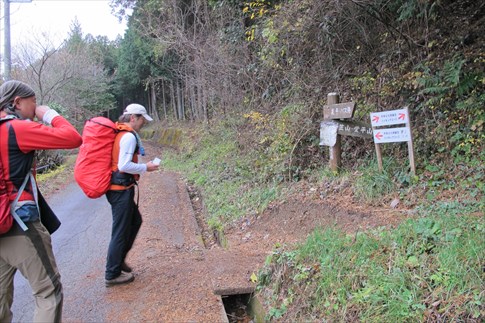 二十二夜供養塔を通過後緩く下って林道出合地点がC6指導標 |