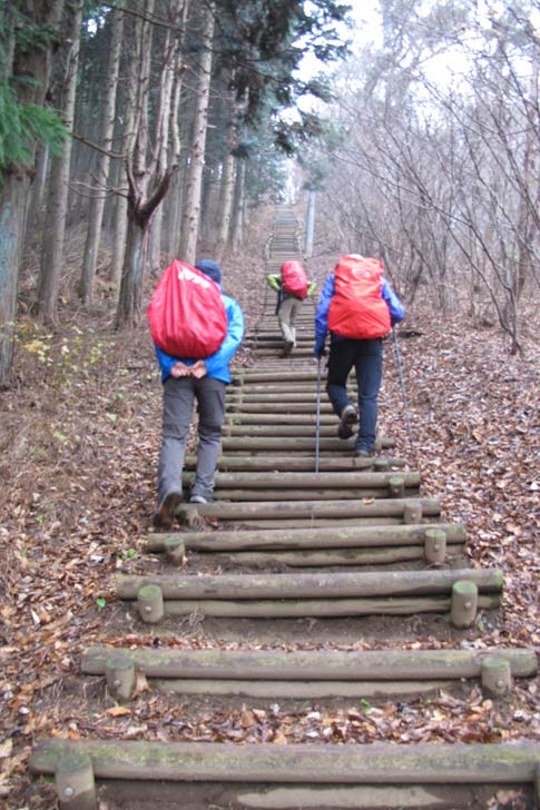 E1指導標からは深くえぐれて歩きにくい試練の木階段登りが待っていました (ノД`) |