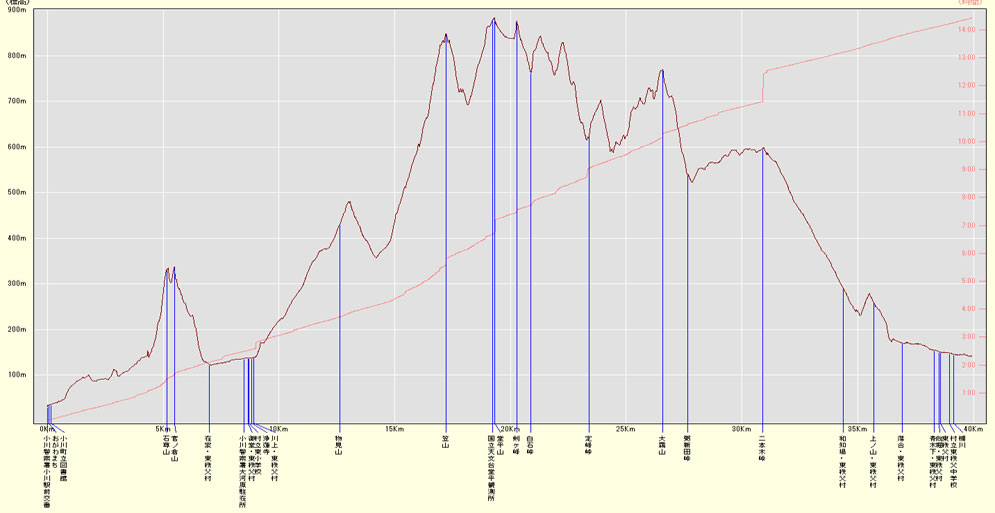 小川町駅標高/91M 標高差/785M 上り累積/2247M 総歩行距離/39954M |
