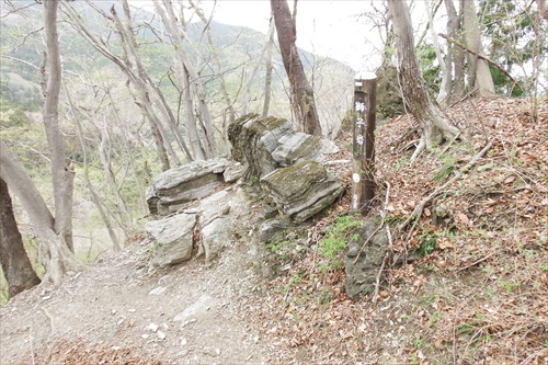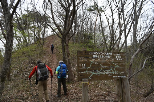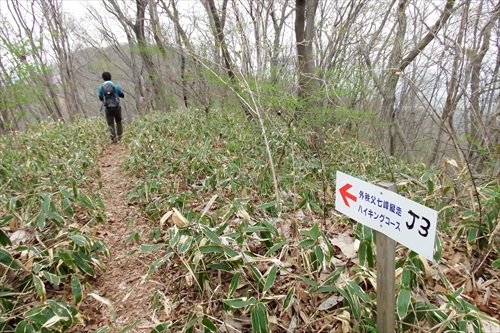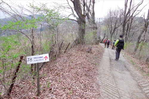二本木峠からの車道歩き後、ここJ2標で登山道に入る |