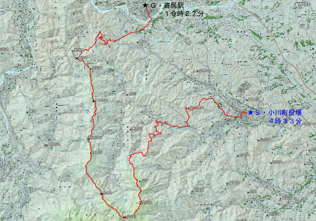 小川町役場標高/90m 寄居駅標高/98m 標高差/786m 累積標高/2250m 総歩行距離/43244m |