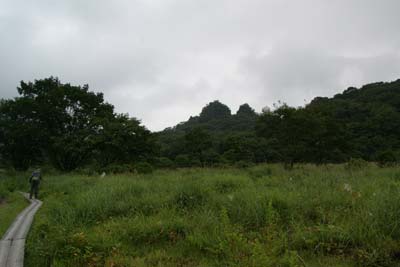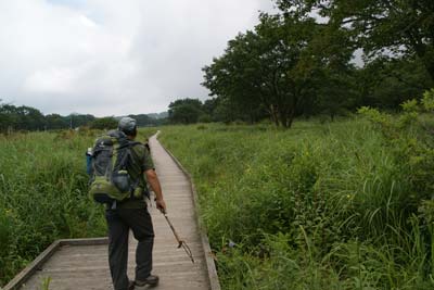 沼の原に設置された木道「ゆうすげの道」を抜け笹原を過ぎると東屋が建つ