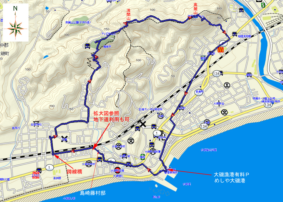 高麗山〜男坂〜高来神社〜大磯宿史跡〜大磯港駐車場 |