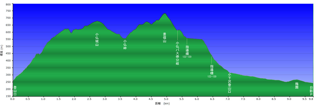 日影駐車場標高/242M 標高差/485.1M 累積標高/711.6M 総歩行距離/9774M |