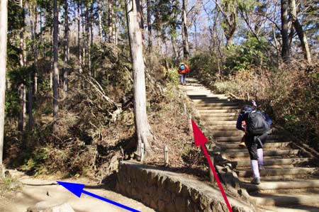 | 至れり尽くせりの登山道 | 青=モミジ台への巻き道 赤=数分で高尾山山頂へ | |||