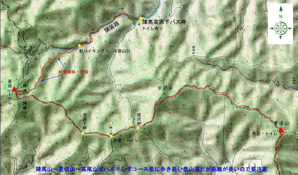 | (計曲線 50M 主曲線 10M) 高尾山口駅前駐車場標高/190M 陣馬高原下駅バス停標高/318M 標高差/667M 総歩行距離/18730M |