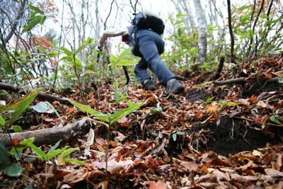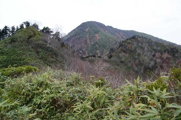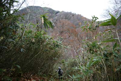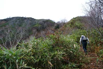 | 深い熊笹地点を緩く下って本尾根へ取りつく | 熊笹が刈り払われており歩きやすい(感謝) | ||||