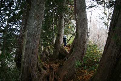 | 落ち葉が多いルートなので上り下りともスリップ注意! | 杉?サワラ?の痩せ尾根でひと休み | ||||