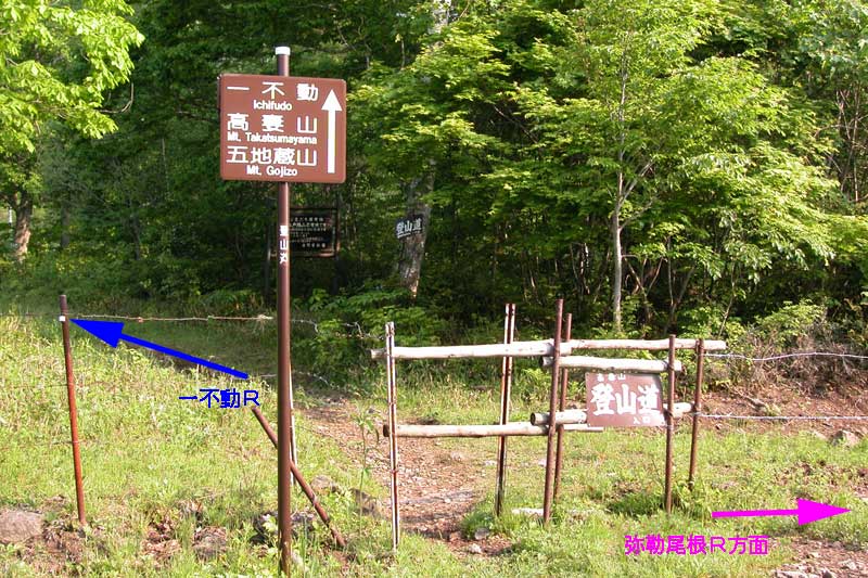 | 弥勒尾根新道はここを右折してピンク矢印方面へ進む 第二ゲート(一不動ルート登山口) |