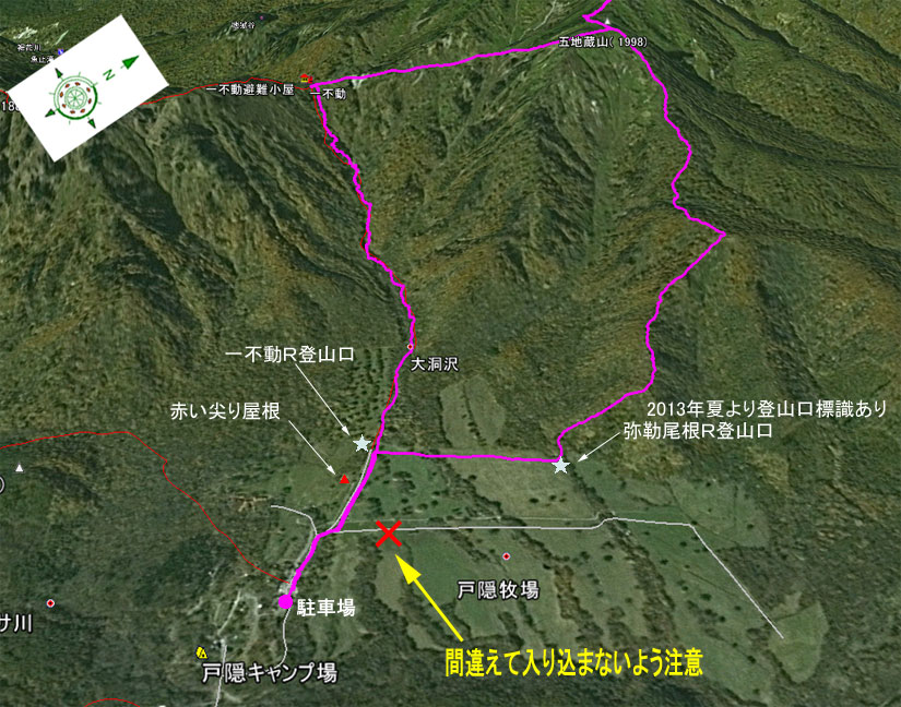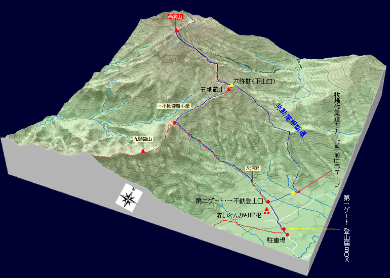 | 一不動ルート & 弥勒尾根ルート 鳥瞰図 (注)2013年現在・登山専用駐車場がバス停前に新設され旧駐車場は使用不可となりました |