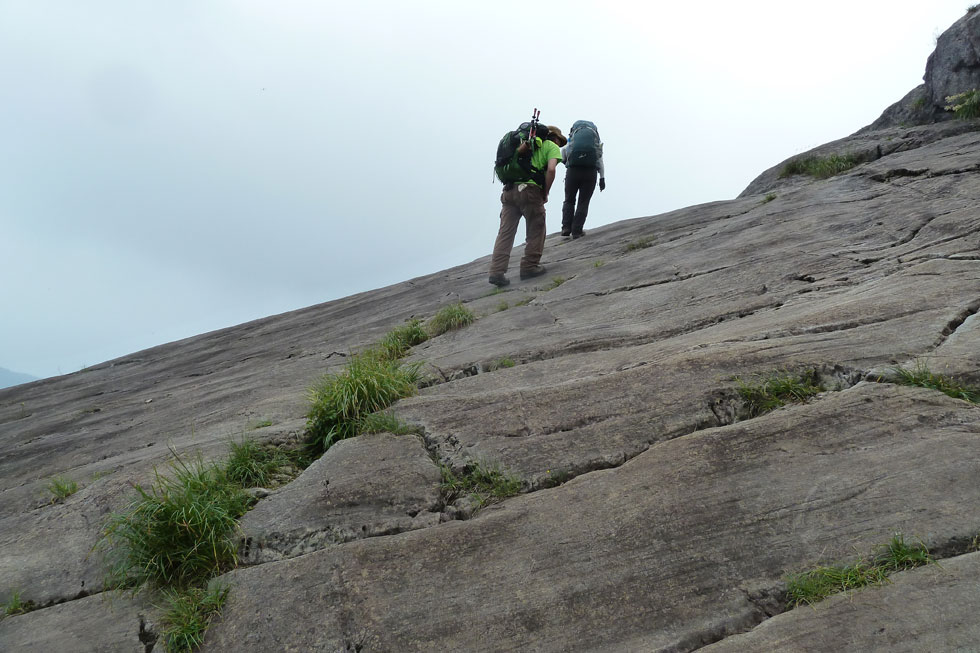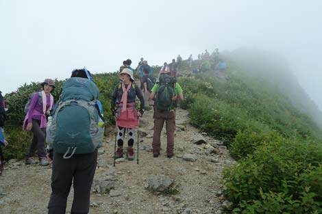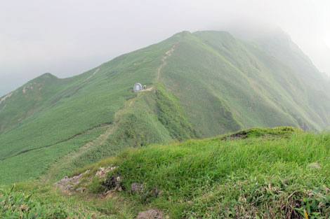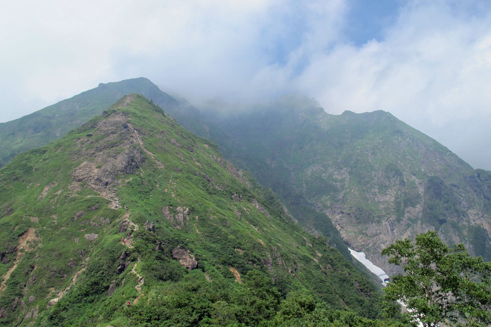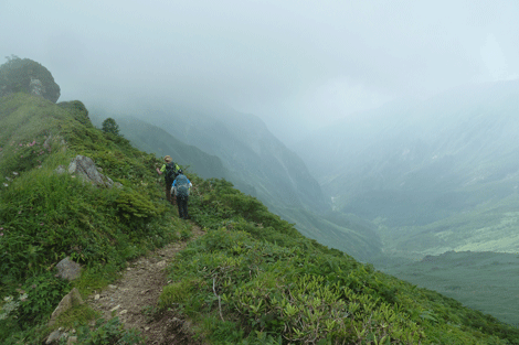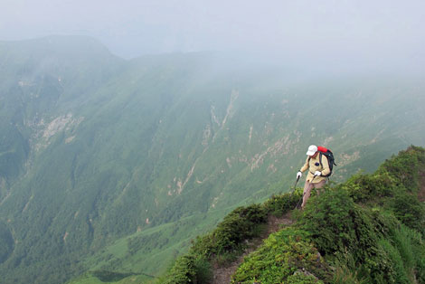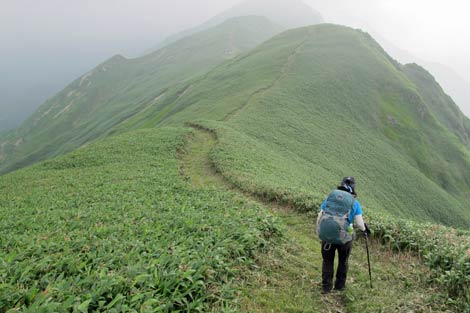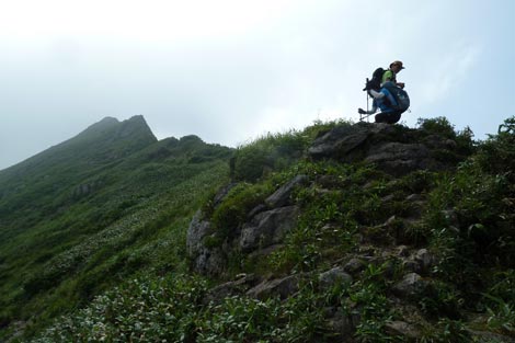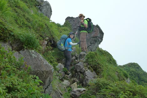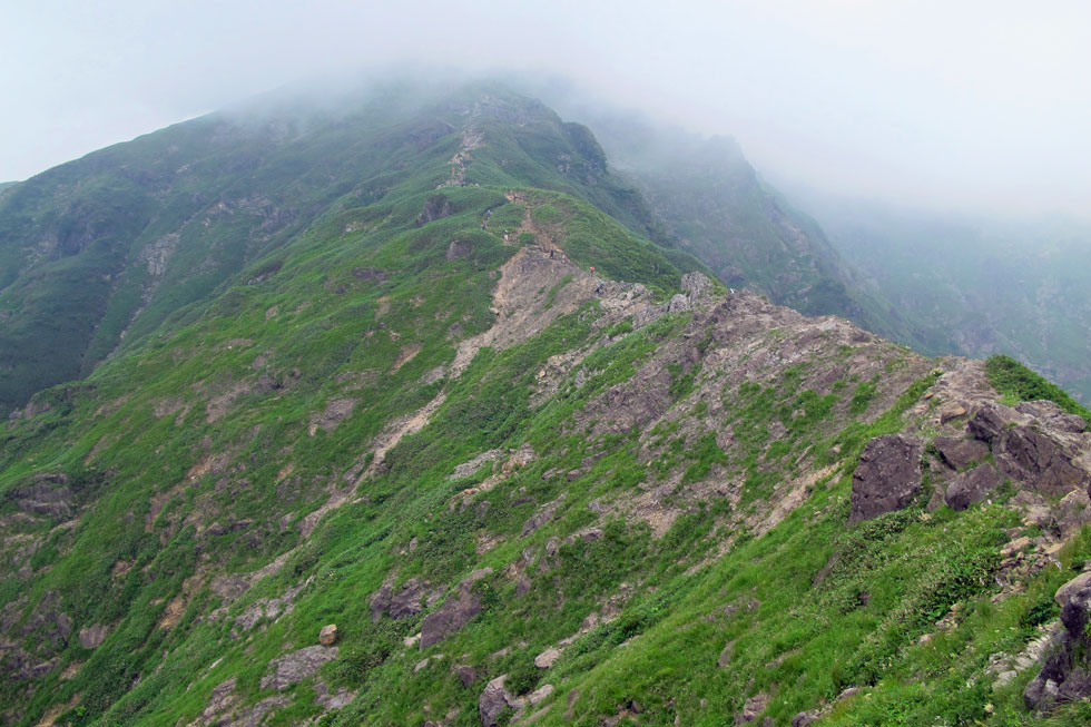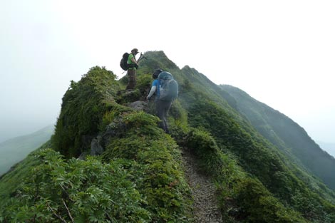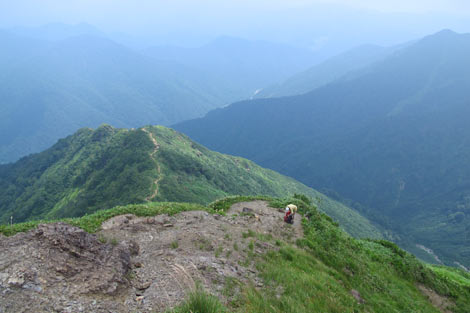 | 尖り稜線のてっぺんに付けられた狭〜い登山道を慎重に進む (;´Д`) | ||||