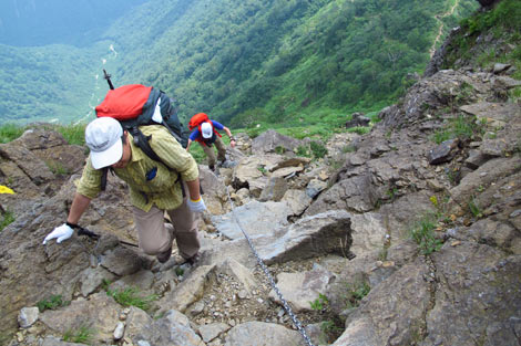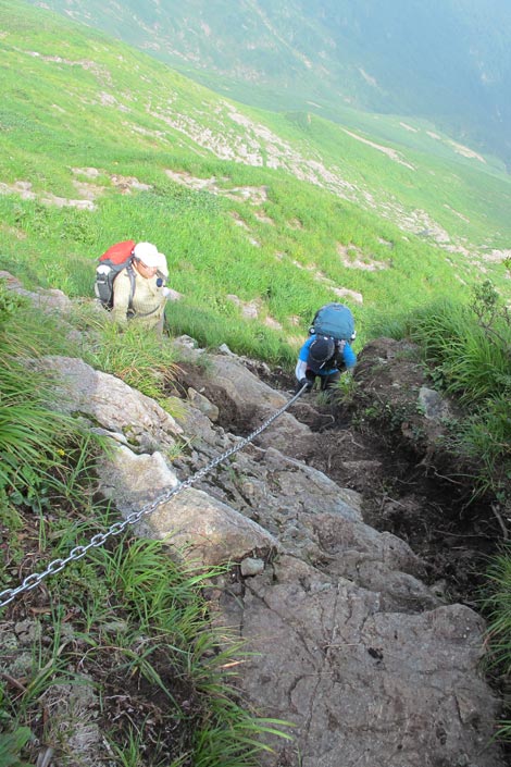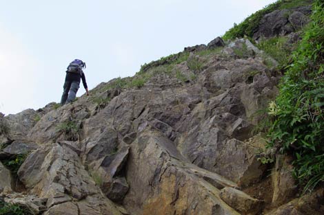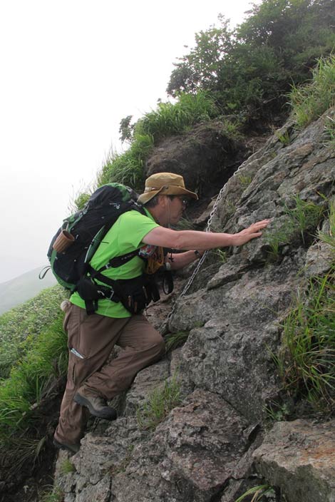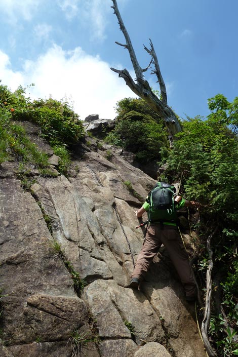 | クサリ場・1 このクサリ場はとっかかりが多いので三点支持で登れる |