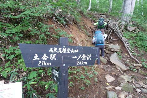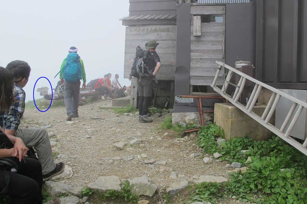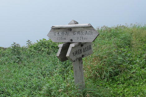 | 肩の小屋(トイレ有り)・水&山バッジ販売 トイレ側のベンチ後の指導標に従い万太郎山方面へ進む |