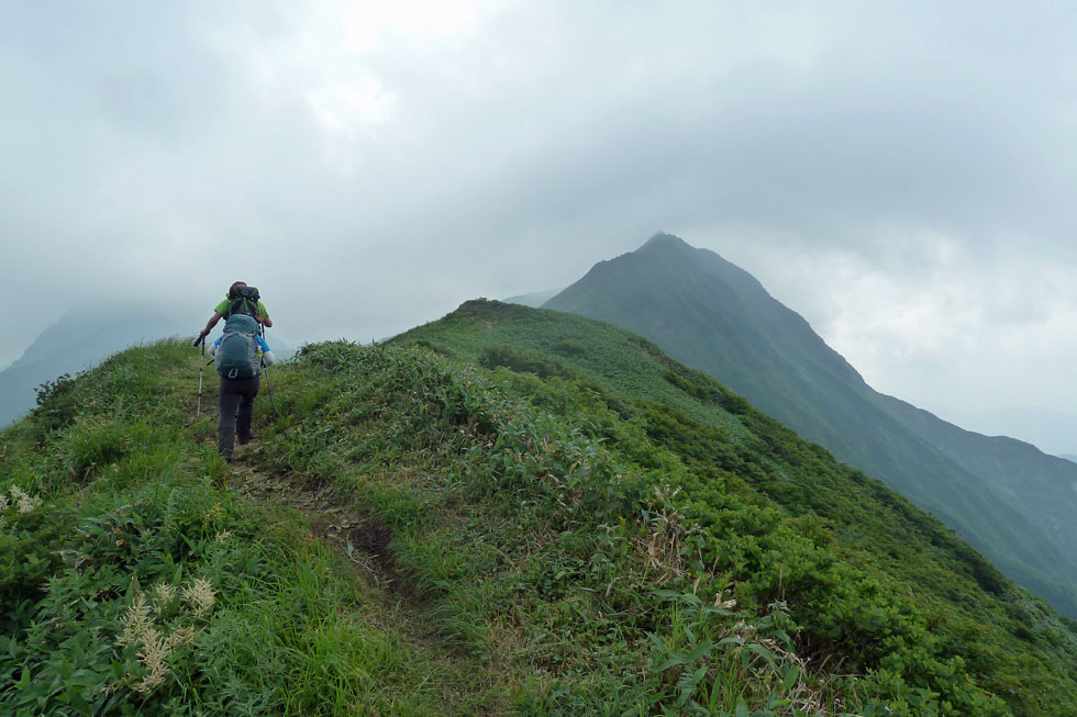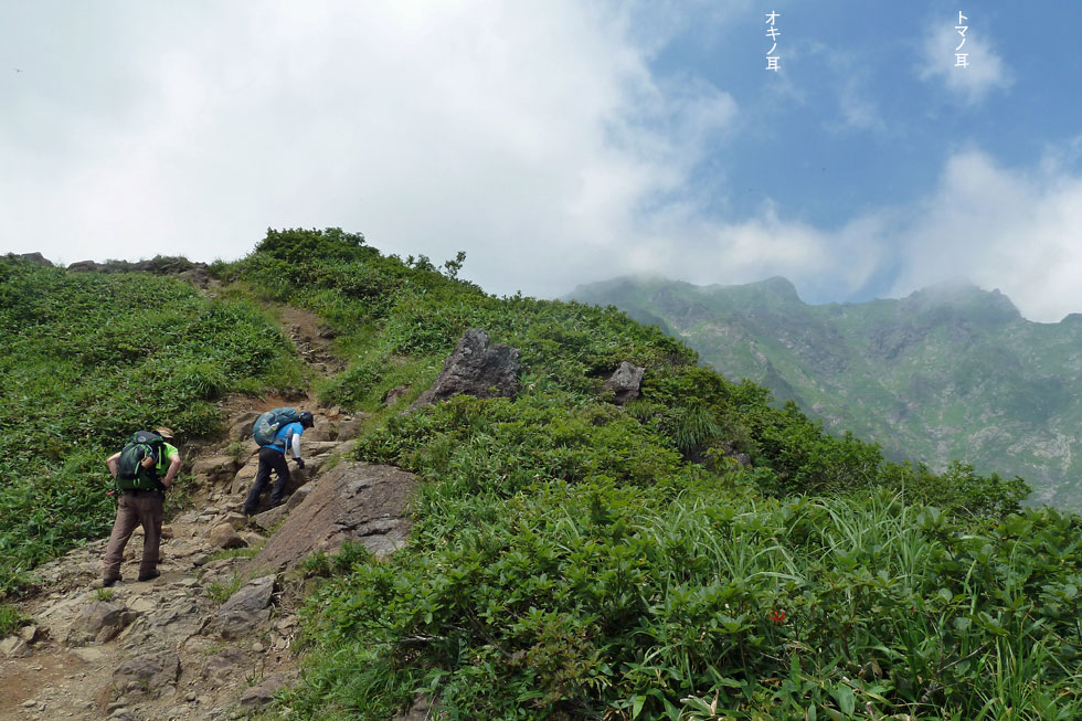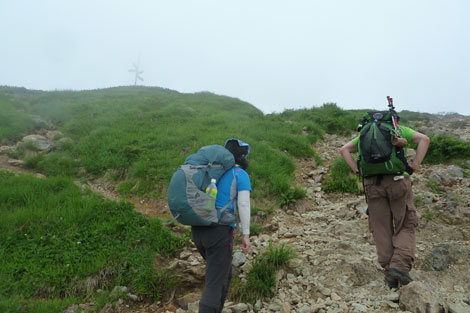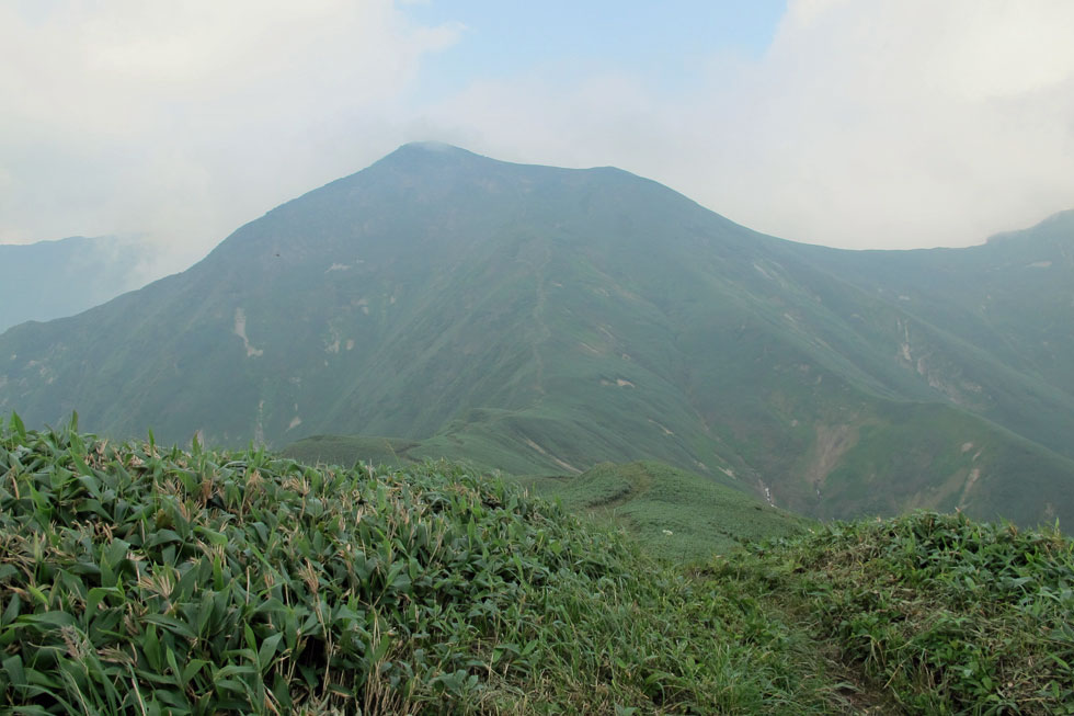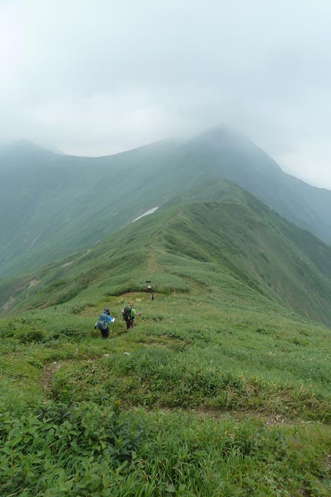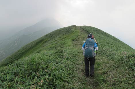 | 協議の結果、雷の心配はないと判断して大障子避難小屋まで足を延ばす 《写真中央の小ピーク(小障子ノ頭)を越えた先の鞍部に大障子避難小屋が建つ・CTは50分》 |