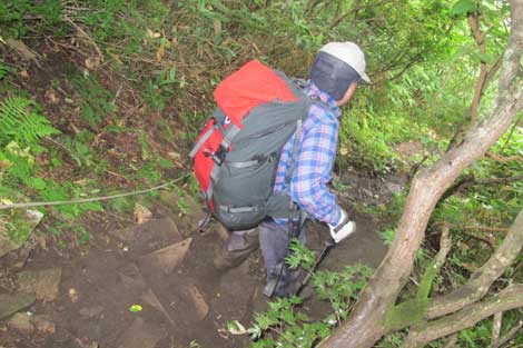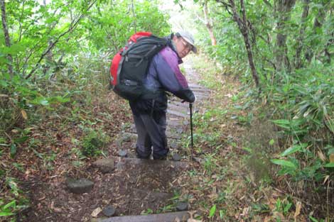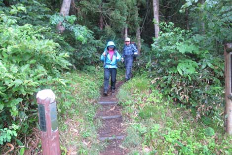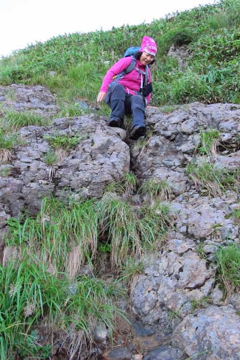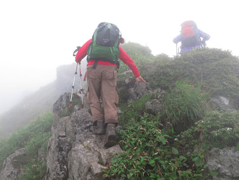 | 朝露に濡れスリップしやすい露岩地帯を慎重に下る | 先は長いな〜〜(ノД`) | |||