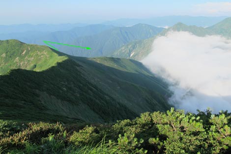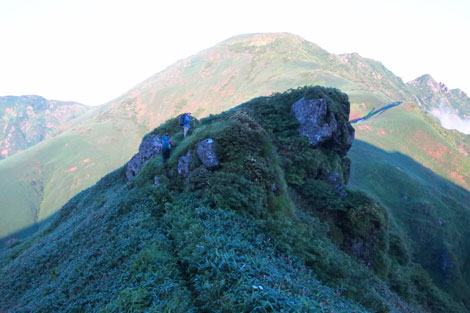 | 万太郎山よりルート確認 | 痩せ稜線を歩く | |||