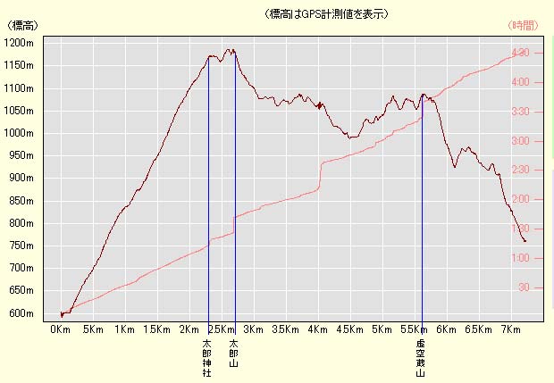 | 太郎山表参道P標高/580M 菖蒲(勝負)平P標高/750M 標高差/584.3M 総歩行距離/7217M | ||||