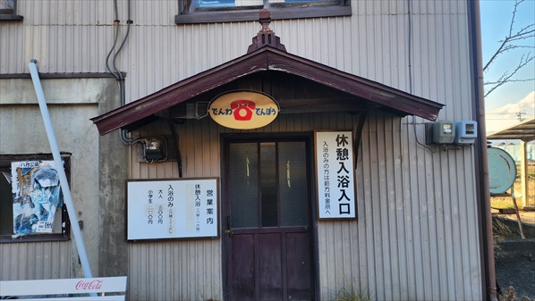 | この入口は休憩入浴入口・日帰り入浴入口は建物南側 日帰り入浴料=500円 休憩入浴料=750円(冬期割り増しあり) |