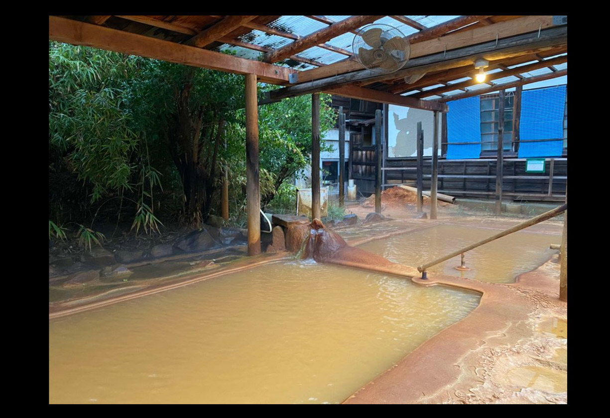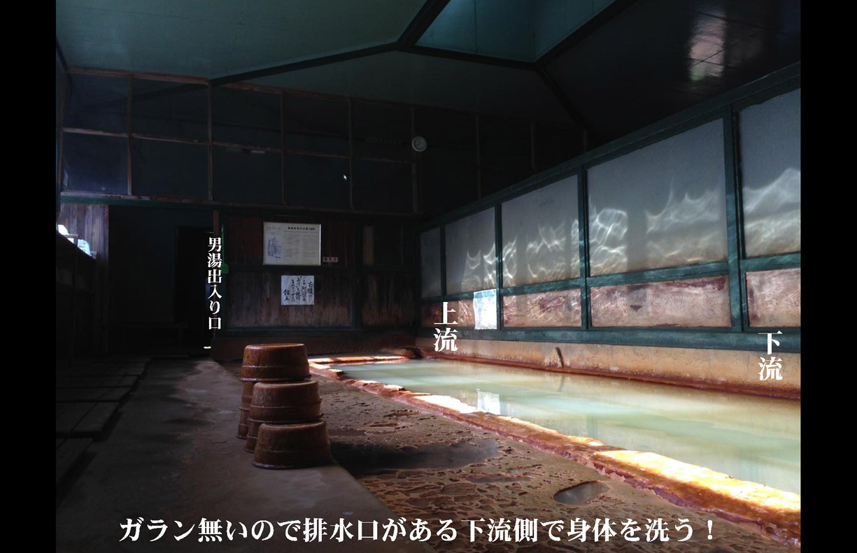 | 混浴露天風呂に入るには内湯で5分以上身体を温めてからタオルで○○○を隠し(女性は湯浴み着用)ながら露天へ向かう | ||||