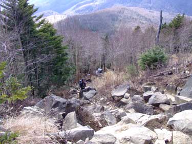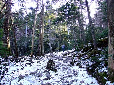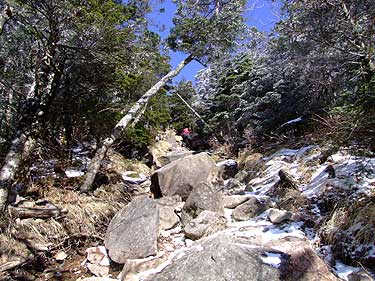 残雪は消えたが相変わらずガレ道の急下降が続く |