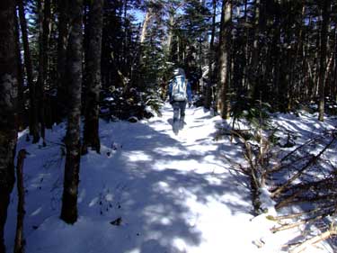 高度が上がる毎に積雪量が増え、踏み跡はツルテカ状態・・・ 新雪部分を選んでグリップを確保 |