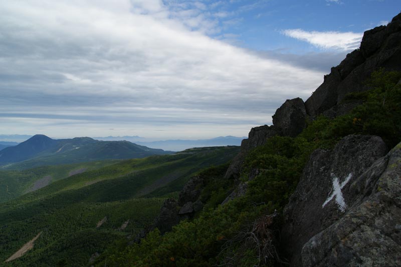 中山峠分岐点の眼下に天狗の奥庭・スリバチ池・黒百合ヒュッテ 蓼科山の右に妙高山・火打山を望む |