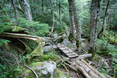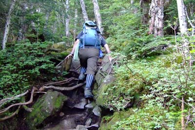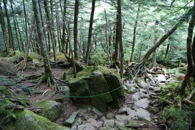 ご覧の様な岩ゴロ道の連続で登りより下りの方が神経を使う登山道 |