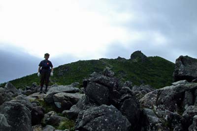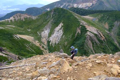 東天狗を目指してガレ場を下る |