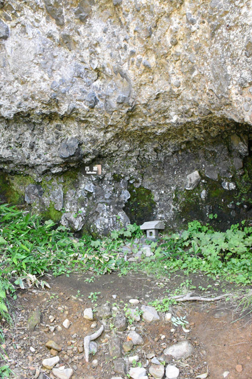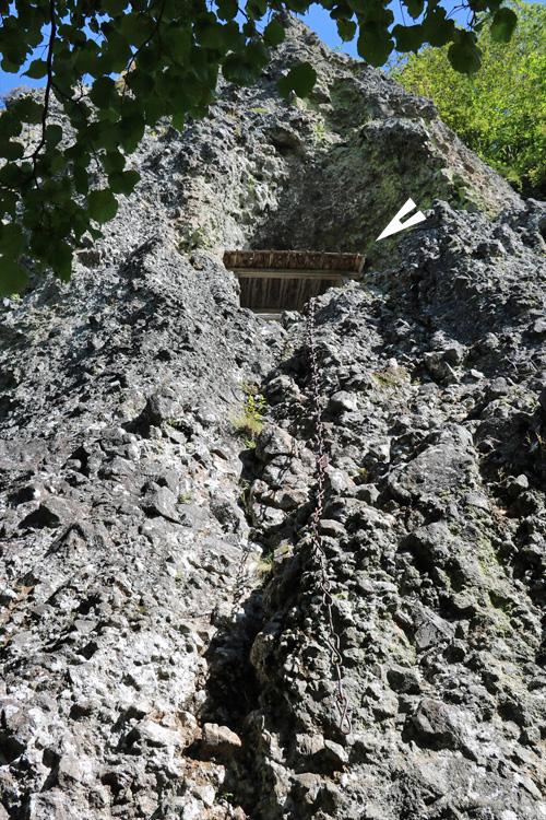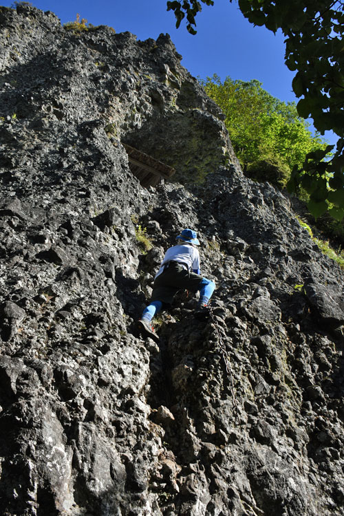 | 戸隠三十三窟のひとつ西窟(さいくつ)に登る 取っつきのクサリが短いため、最初の2メートルほどは腕力勝負 |