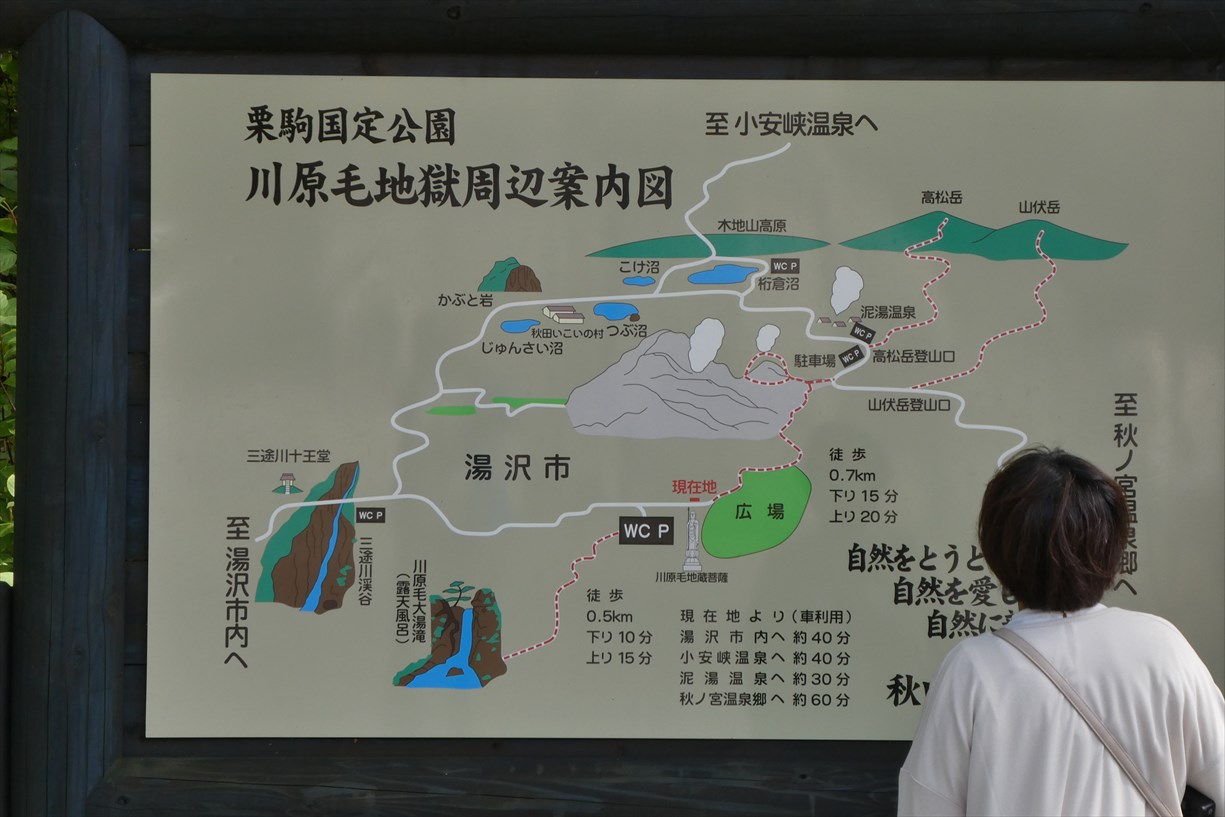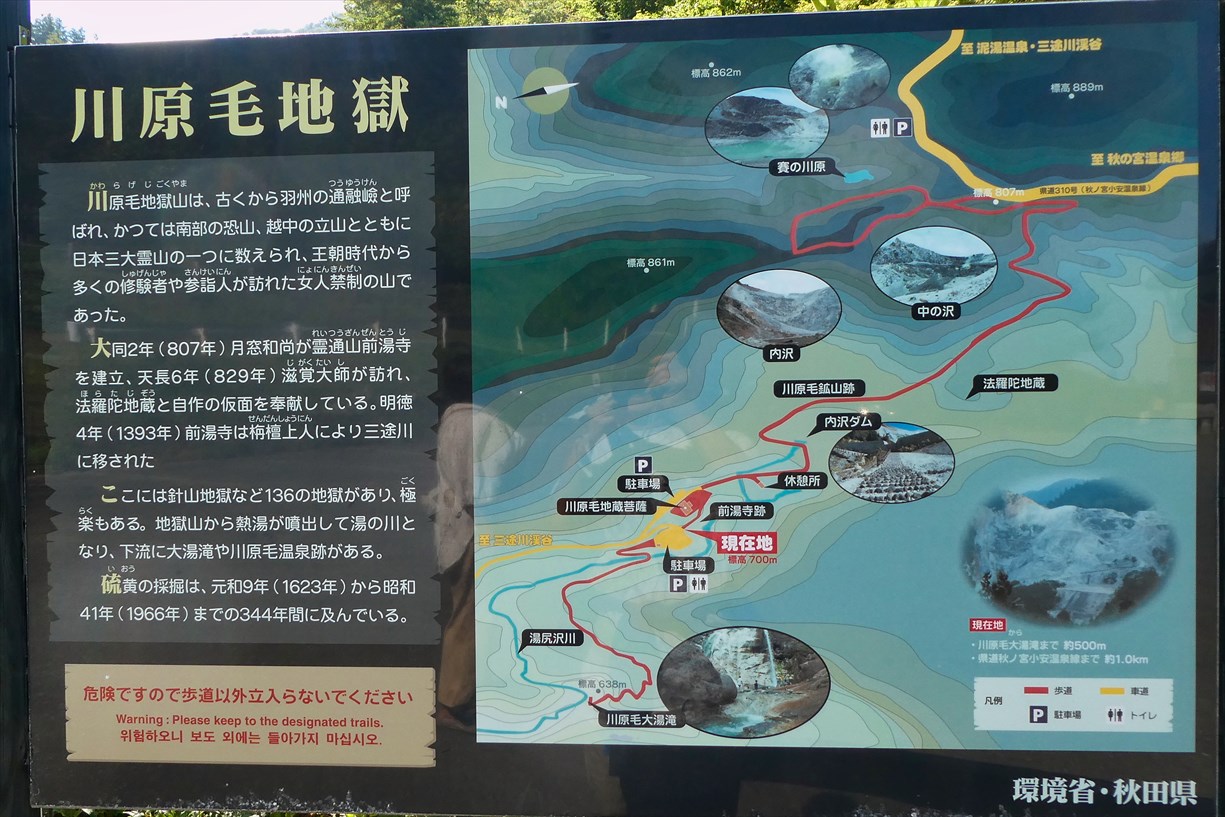 | コースタイム 川原毛地獄駐車場(トイレあり)~川原毛大湯滝駐車場(トイレあり)まで20分~大湯滝まで20分~大湯滝Pまで30分~川原毛地獄Pまで30分 |