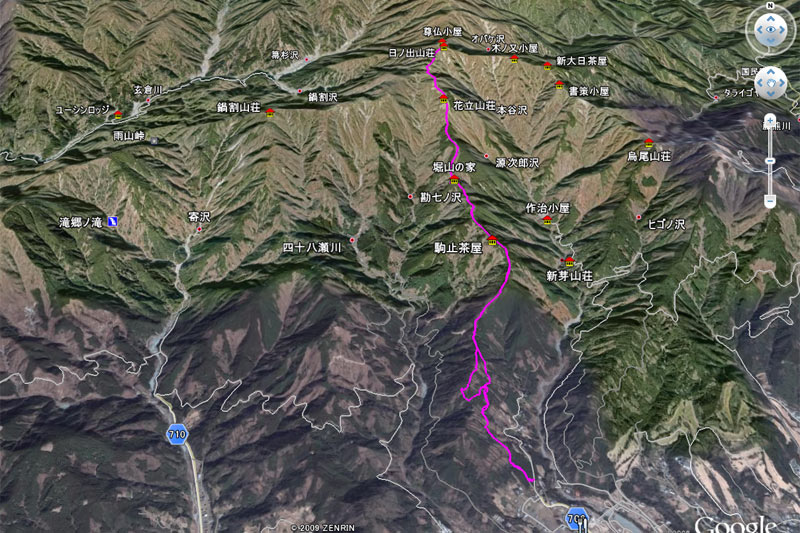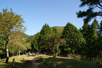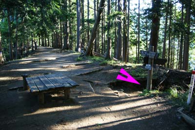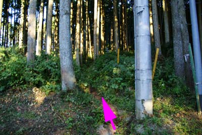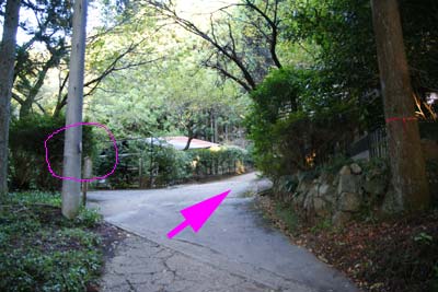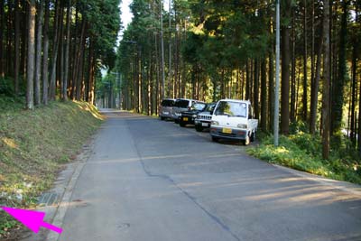 上の写真、右側林道を進み路肩駐車後赤矢印入る |