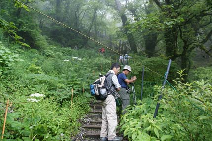 | キレンゲショウマ群生地 植生保護ネットのため上からしか撮せないのが残念 |