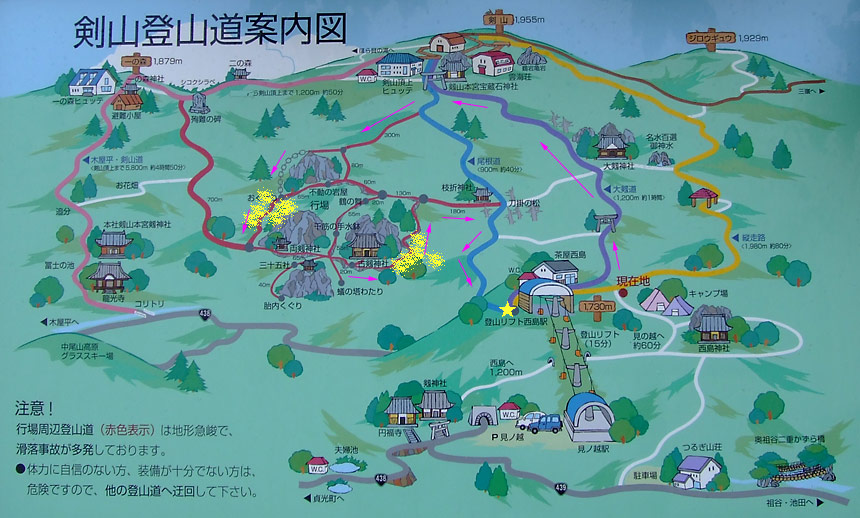 | 一の森まで行く予定だったが悪天候でピンク矢印ルートに変更、黄色塗り箇所はキレンゲショウマ群生地 | ||||