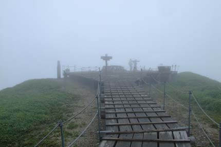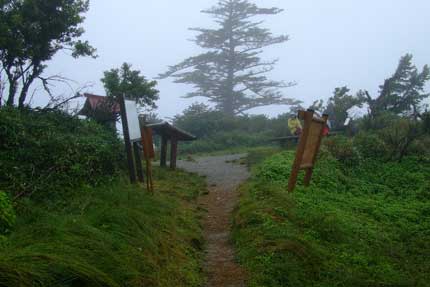 | 平家の馬場と呼ばれる平原地帯も小雨と強風のため | 西日本第2の高さを誇る剣山山頂 1995m 写真だけ撮ってさっさと引き上げる |