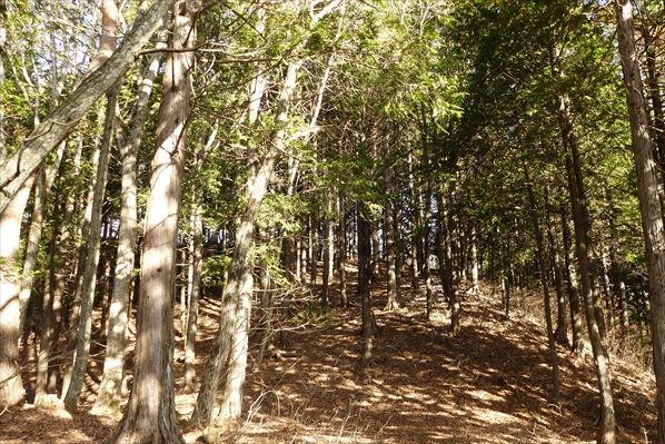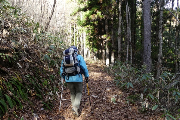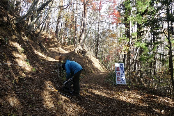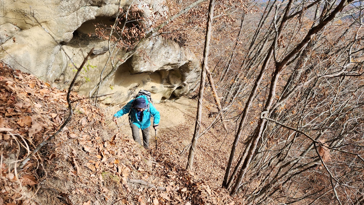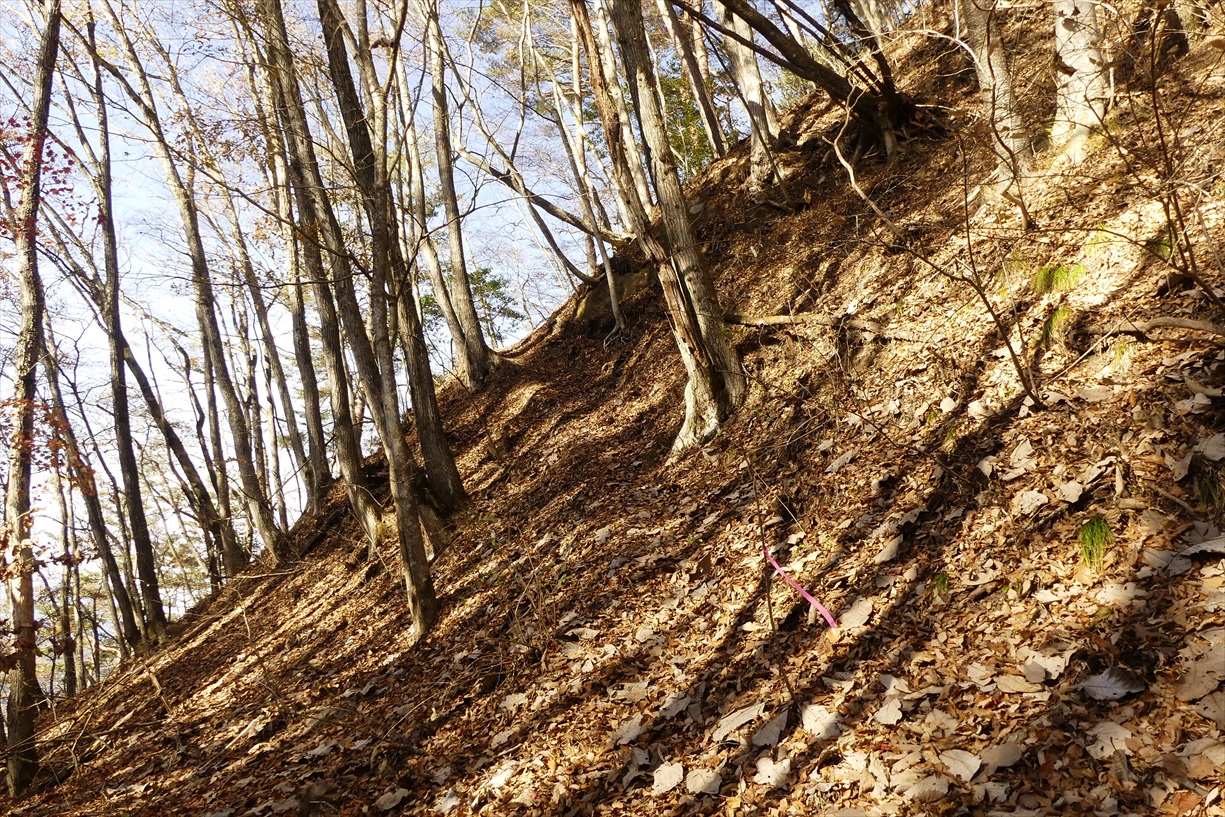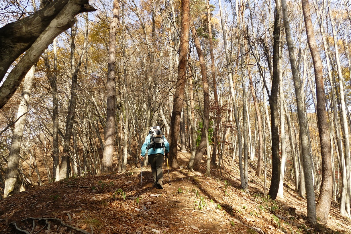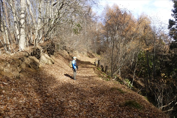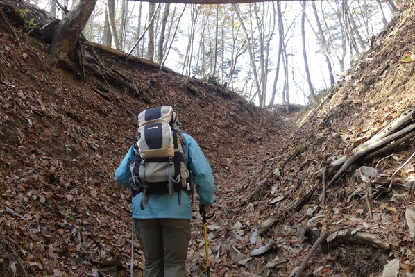 厚い落ち葉が原因で上り下りとも靴のグリップがまったく効かないので要注意! |